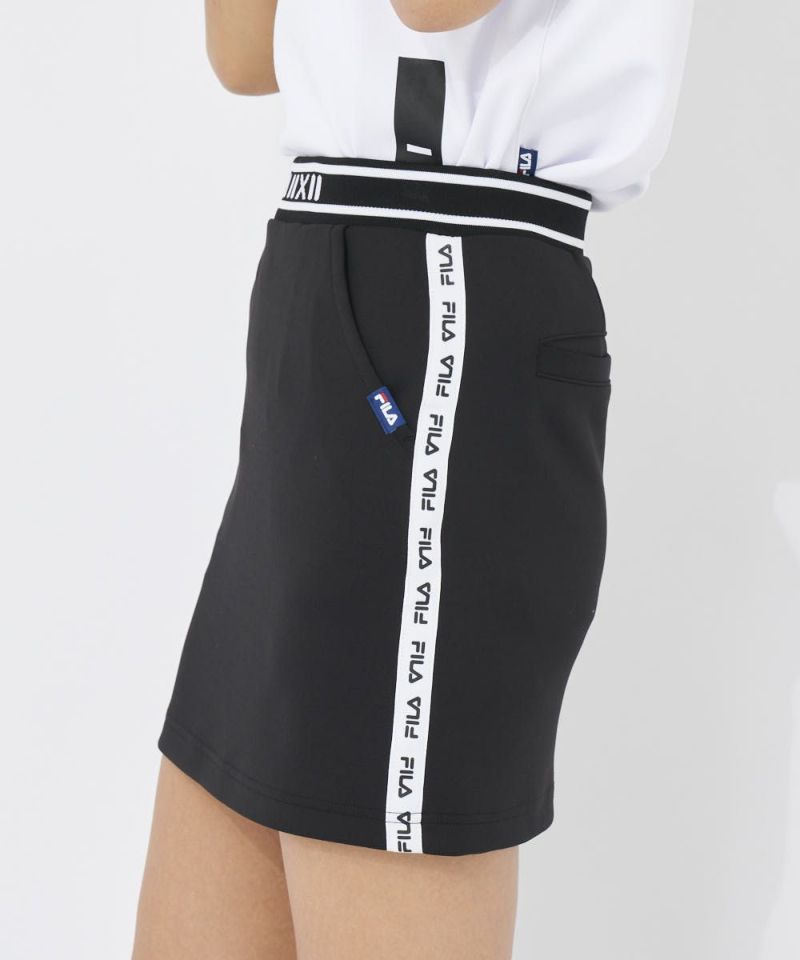 柔らかく軽いダンボールニットを使用したすっきりとしたタイトシルエットのスカート。ロゴテープとジャガードのウエストリブがデザインポイント。安心のインナーパンツセット。