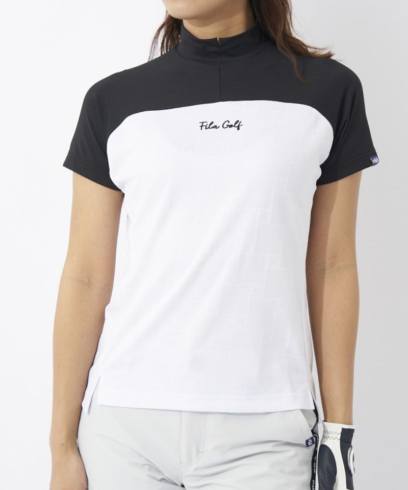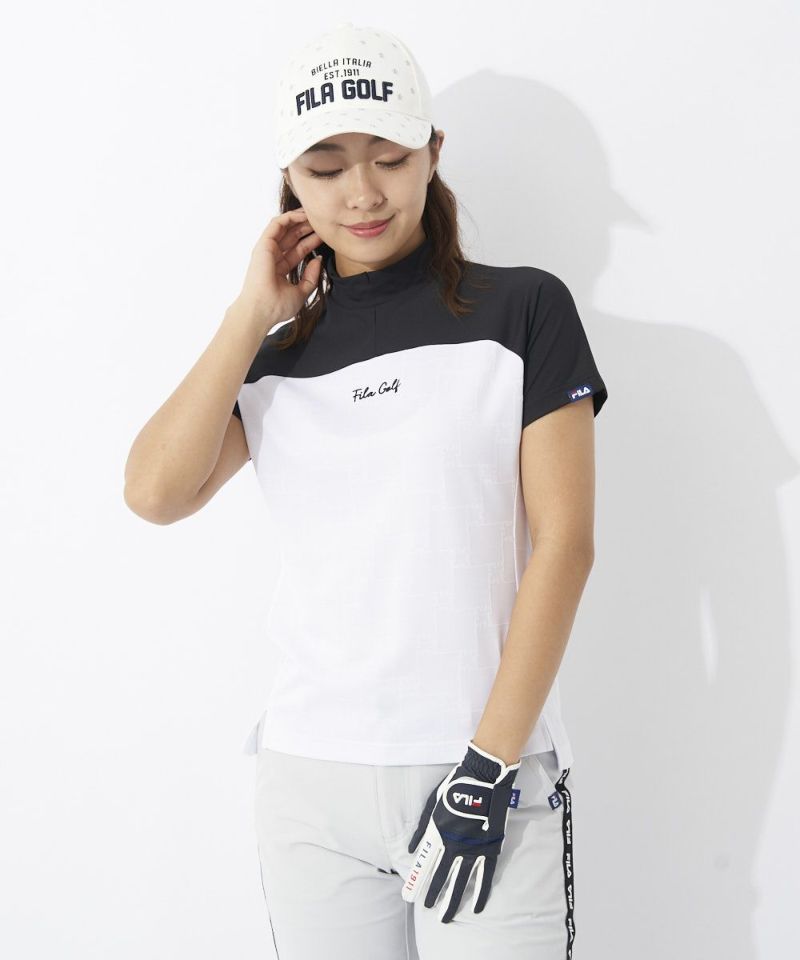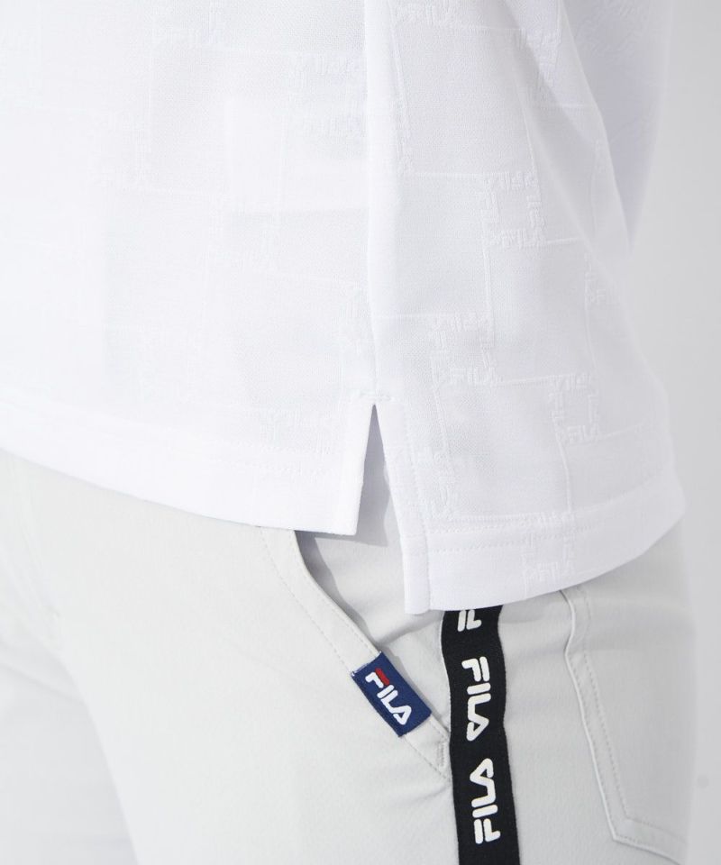 動きやすい変形ラグランスリーブシャツ。脇線を前側に寄せることで、細見せ効果を持たせました。FILAロゴをジャガードで表現したストレッチ性の良い素材を採用。