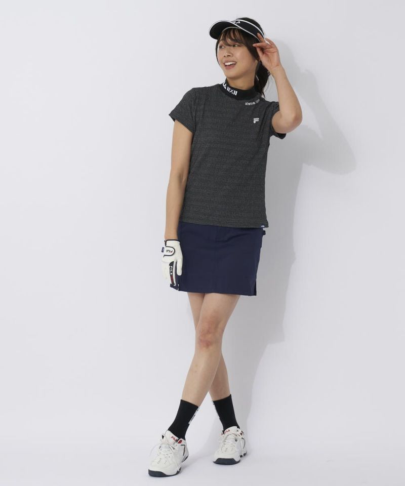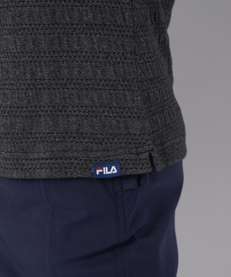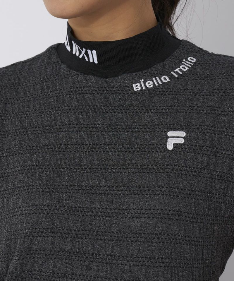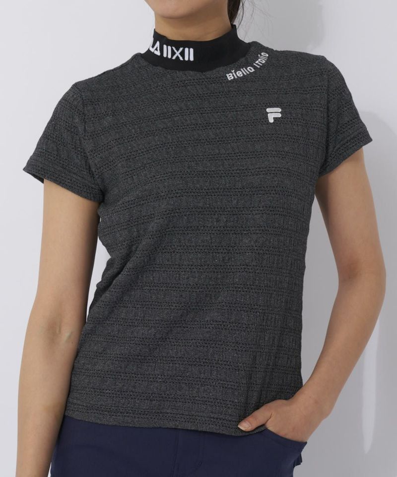 ジャガードでグラフィックを表現したリブ衿が特徴のモックネックシャツ。杢調の、シャーリングがかかった特徴的な素材を採用。