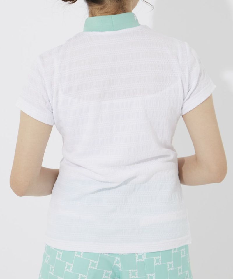 ジャガードでグラフィックを表現したリブ衿が特徴のモックネックシャツ。杢調の、シャーリングがかかった特徴的な素材を採用。