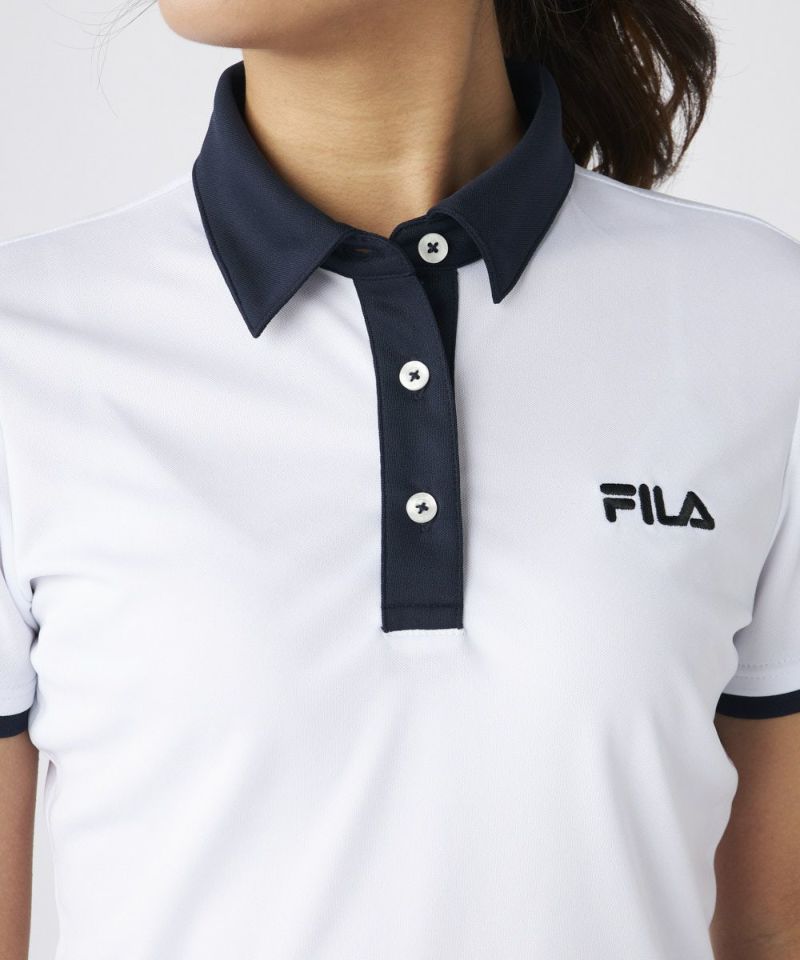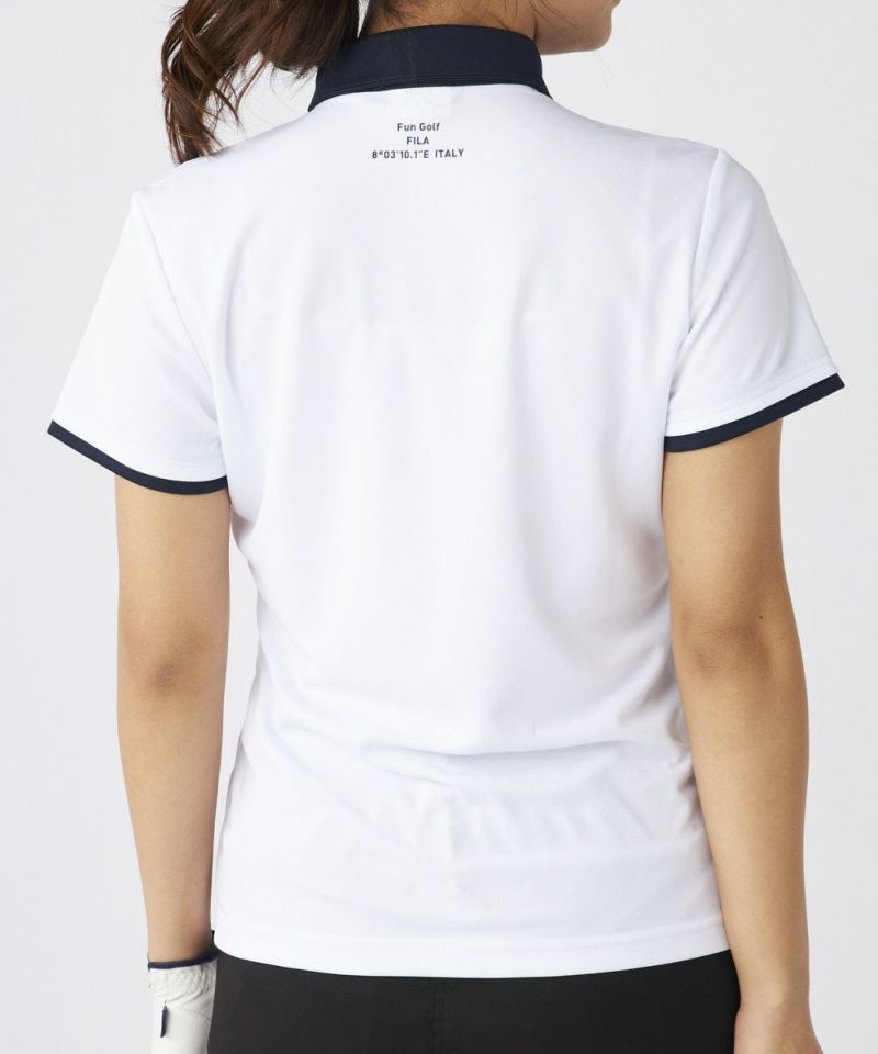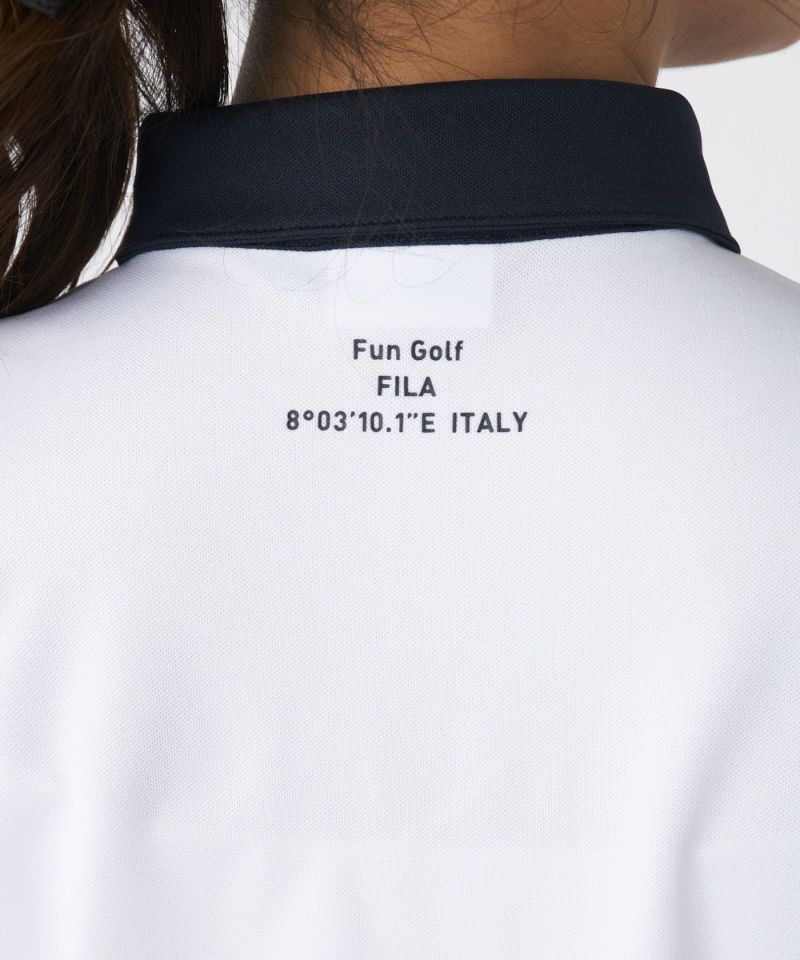 衿のバイカラーがかわいい半袖ポロシャツ。ベーシックなデザインなので、スカート、パンツ選ばずコーディネートを楽しめます。程よい丈感で、アウトでもインでもバランスよく着用いただけます。バックデザインにはフィラゴルフのキャッチコピー【Fun Golf】のテキストを小さく入れており、細部までこだわったオシャレなデザインです。