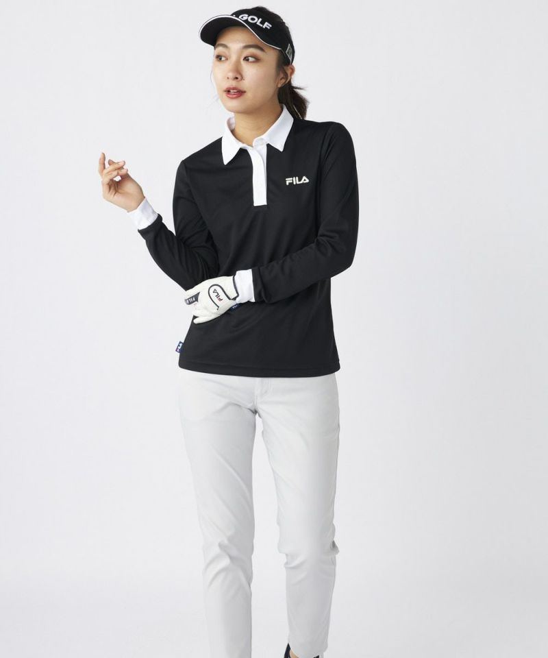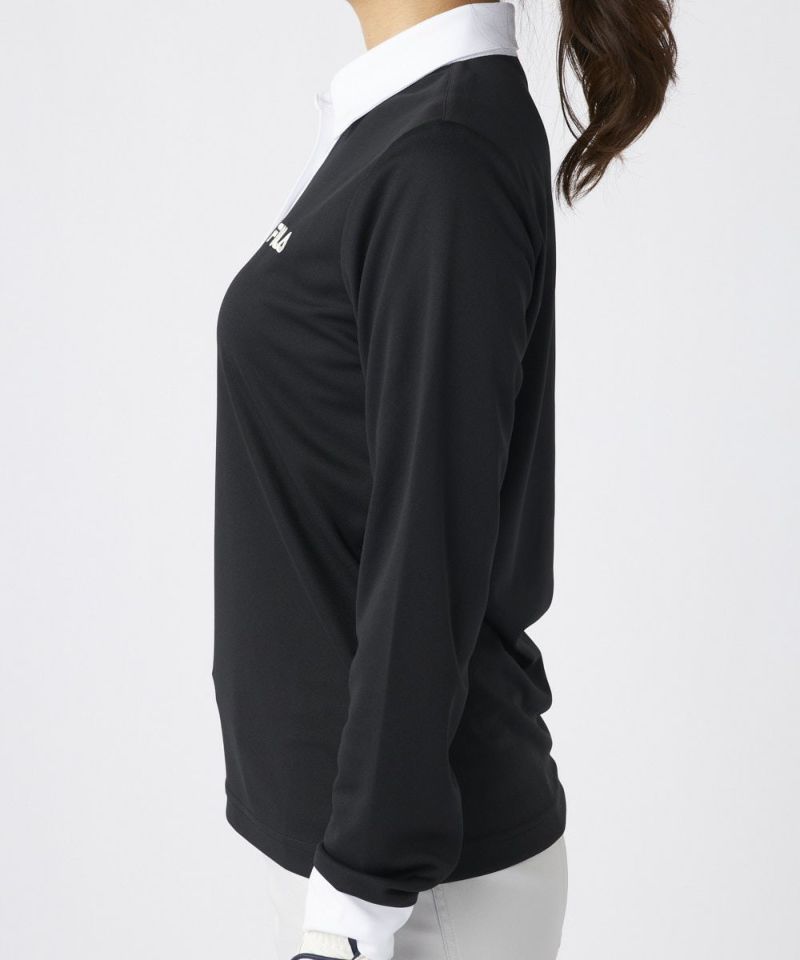 衿のバイカラーがかわいい長袖ポロシャツ。ベーシックなデザインなので、スカート、パンツ選ばずコーディネートを楽しめます。
