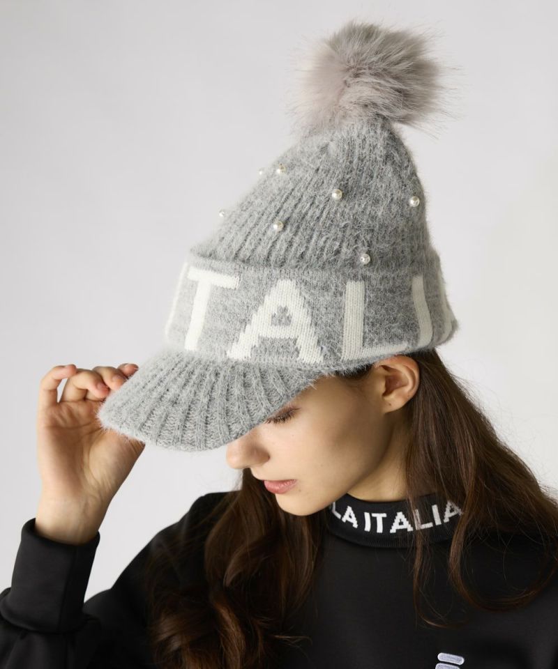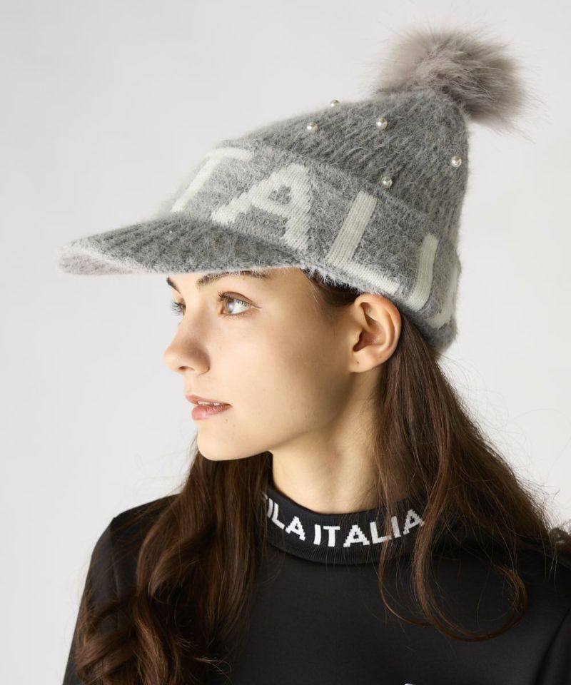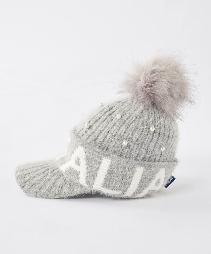 毛足のあるシャギーニットが可愛いニットのキャップ。フェイクパールの飾りが女性らしく、コーディネートのポイントになります。秋冬らしいゴルフコーデにピッタリです!