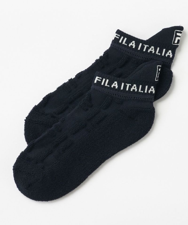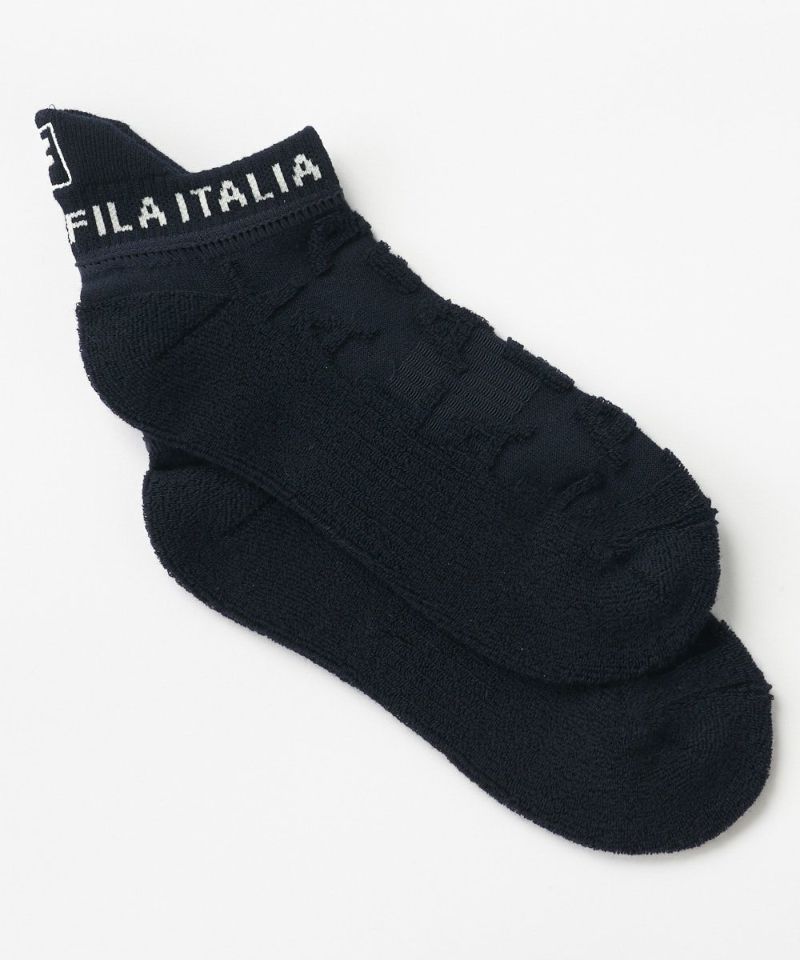 タイポグラフィ柄をパイル編みで表現した、スタイリッシュなミニ丈ソックスです。シンプルながらもFILAらしいモダンな柄が、足元の洗練されたアクセントに。シューズを脱いだ際にも、さりげないファッション性を発揮し、大人のスポーティスタイルを引き立てます。