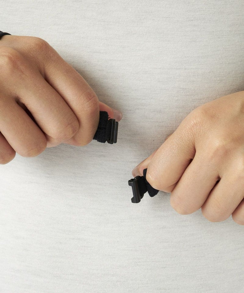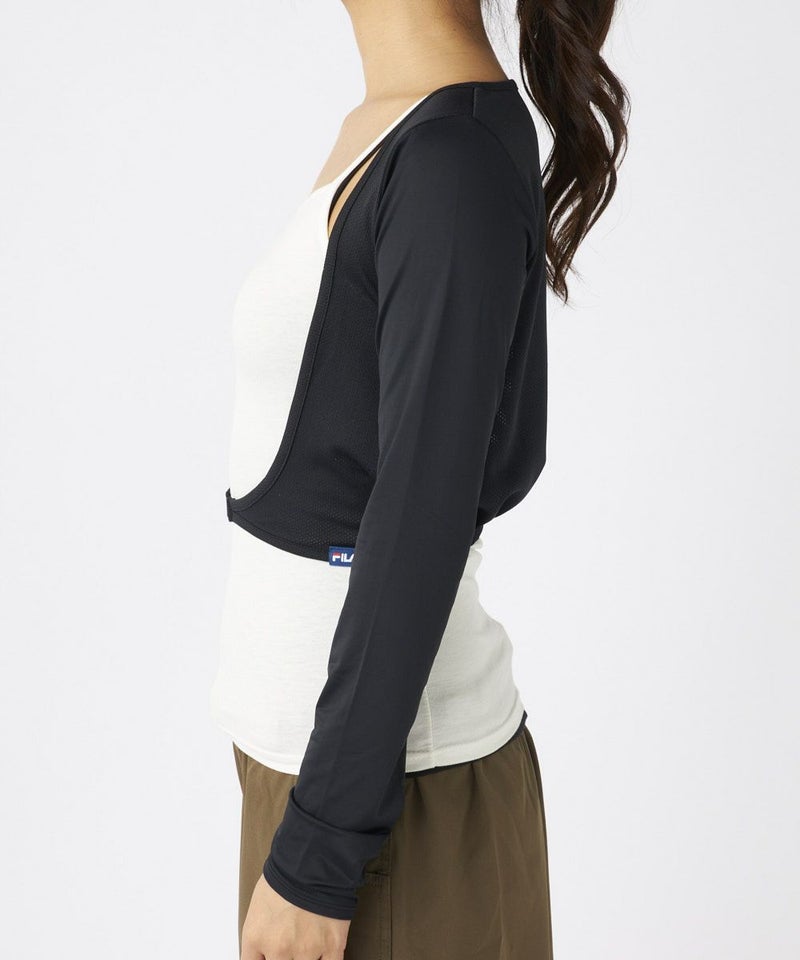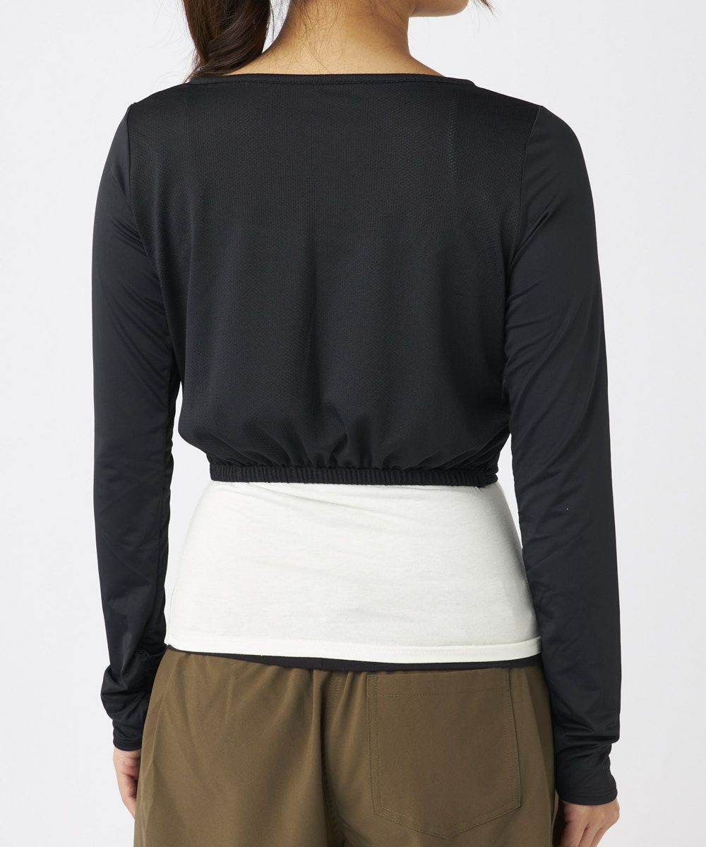 袖部分は接触冷感の機能糸を使用したベア天竺を採用。シャーリング加工を施し女性らしいディティールをプラ ス。グローブに重なる長さでしっかり日除けします。身頃のメッシュ素材は皮膚接着面積が少ない為汗をかいてもべとつかず蒸れを軽減します。