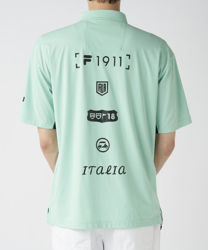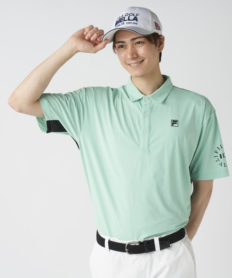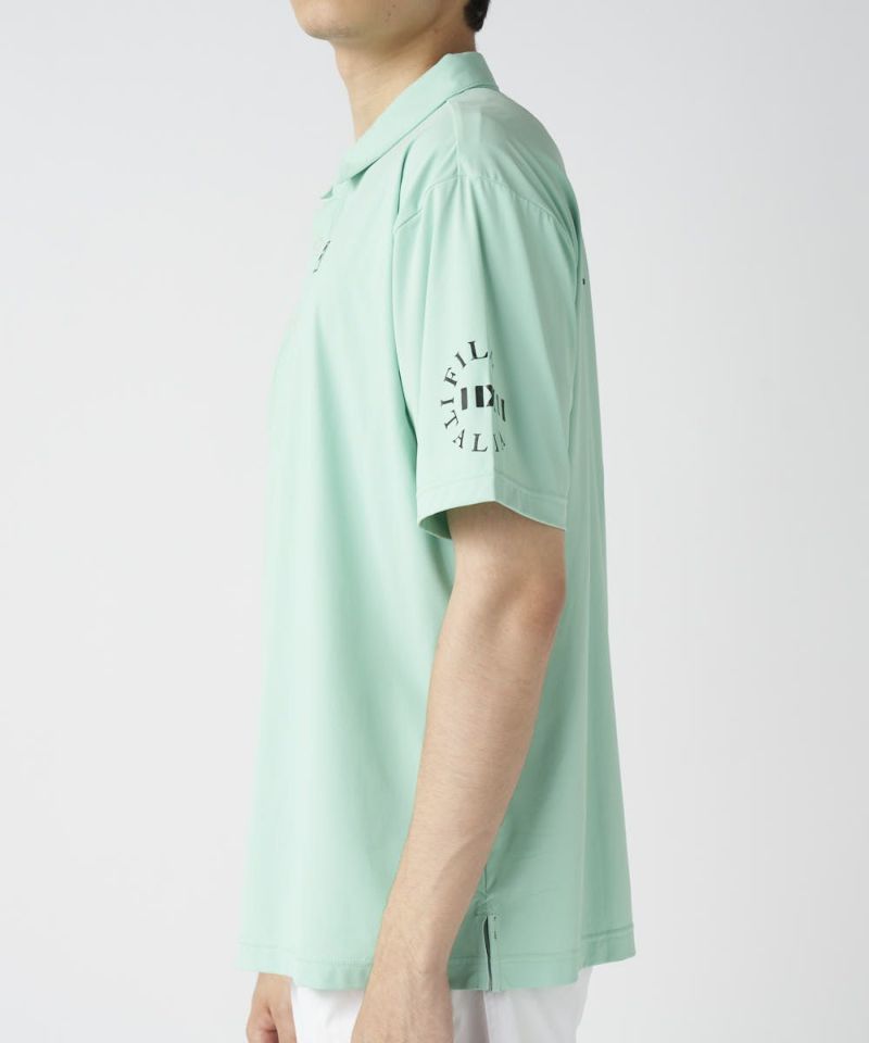 脇の切り替えと、バックプリントが特徴のポロシャツ。シンプルにショートパンツで合わせるスタイルがおすすめです!接触冷感機能付きで、夏ゴルフも快適に楽しめます。