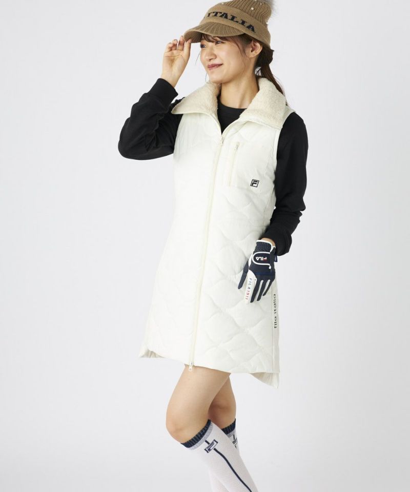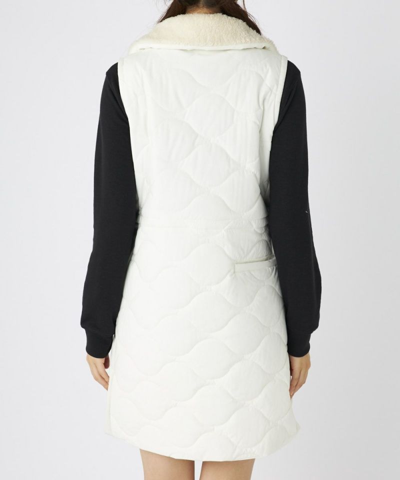 柔らかなキルト加工が上品な印象を演出し、衿元のボアが優しく可愛らしいアクセントを添えます。フルジップ仕様で着脱もスムーズ。ウエストは内側のスピンドルで調整可能なため、好みのシルエットでスタイルアップ効果も期待できます。