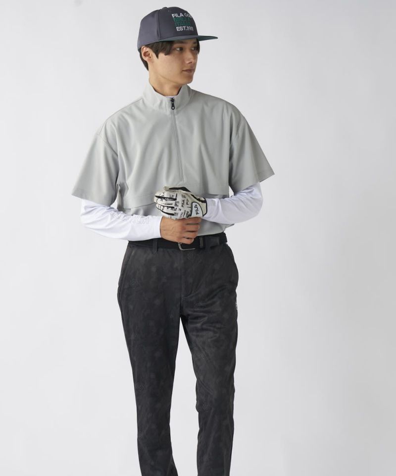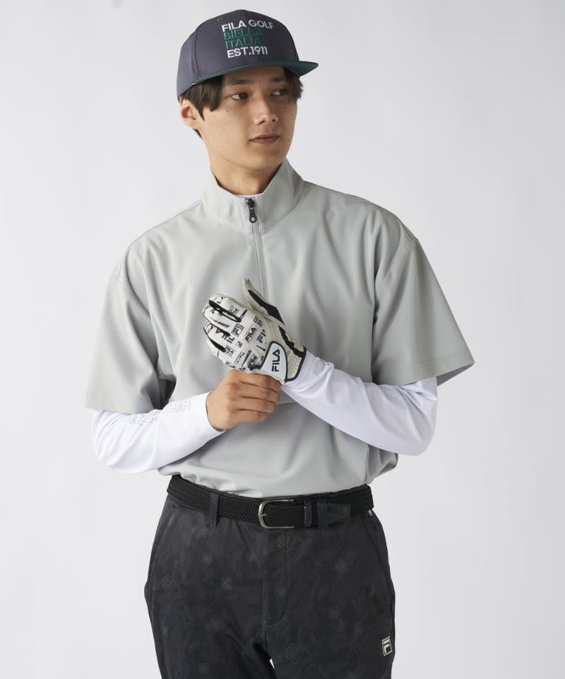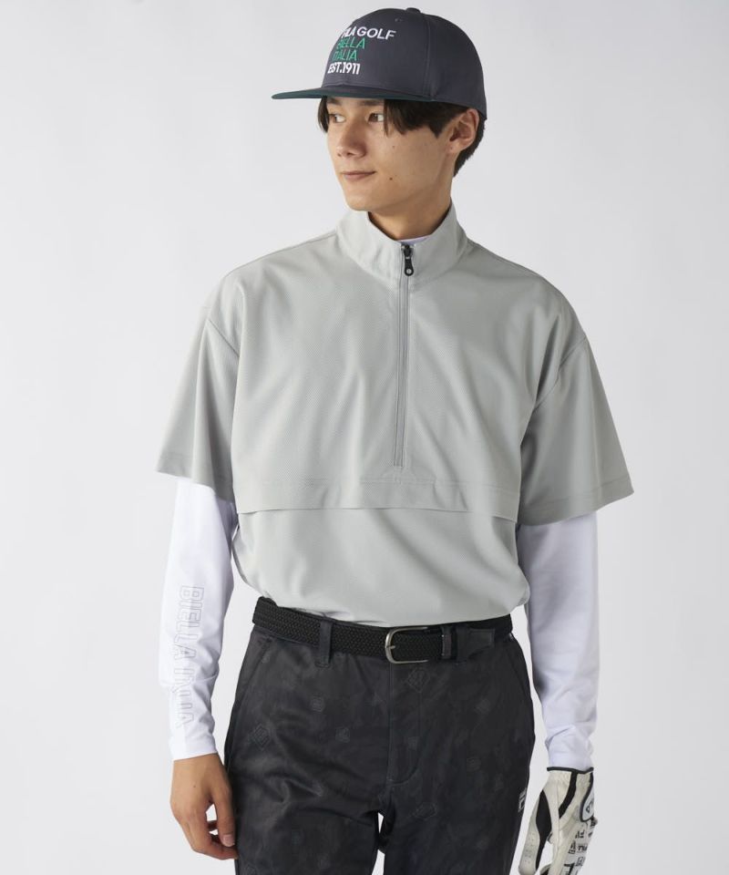 長袖インナーと半袖プルオーバーがセットになった、レイヤード風のデザインが魅力です。ハーフジップ仕様でスポーティな印象を与えつつ、ポップコーンジャガードの繊細な表情が上品なムードを演出。機能性とファッション性を兼ね備えた、FILAらしい一着です。