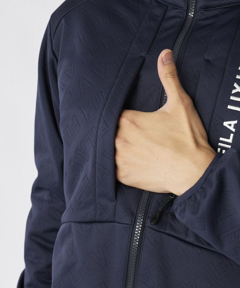 ストレッチ性の高いFILAオリジナル柄でキルティングを施した3層ボンディング素材を使用。外からの冷たい風を防ぐ防風機能と、体温を逃さない保温性を両立。ボンディング特有のハリがありながら、高いストレッチ性がダイナミックなスイングをサポートし、プレー中のストレスを軽減します。軽快で暖かい、秋冬に最適な素材です。