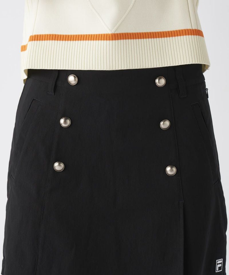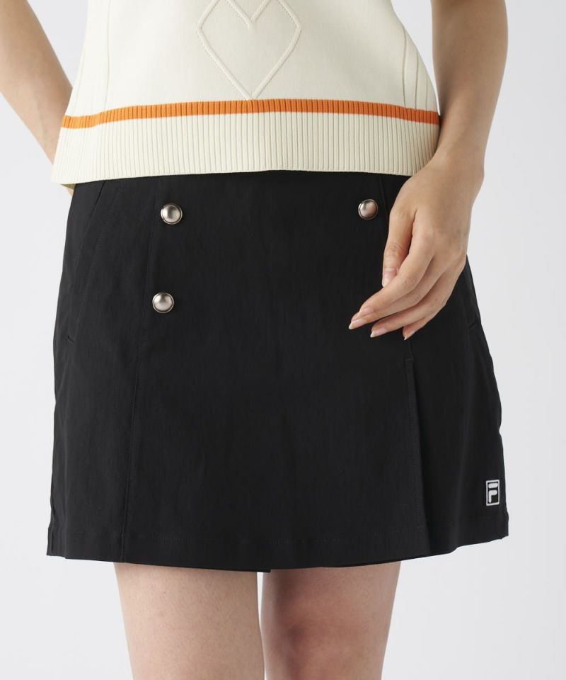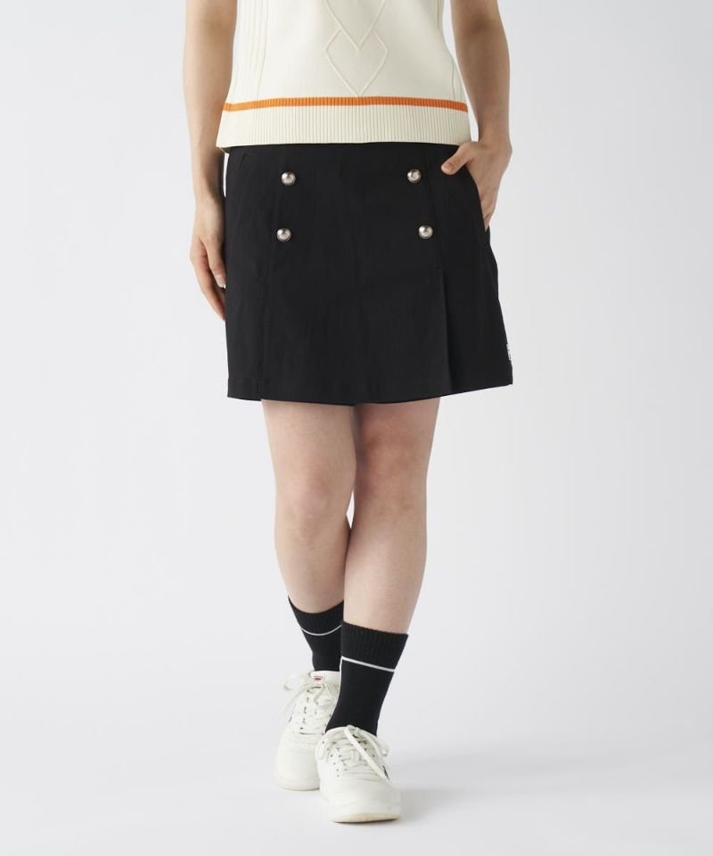 スカートのようなフェミニンな見た目でありながら、ショートパンツの動きやすさを兼ね備えたキュロットタイプ。高めのウエストデザインとすっきりとしたAラインシルエットが、脚長・スタイルアップ効果を発揮します。メタルボタンが上品なアクセントとなり、大人の女性のアクティブスタイルに華やかさを添えます。