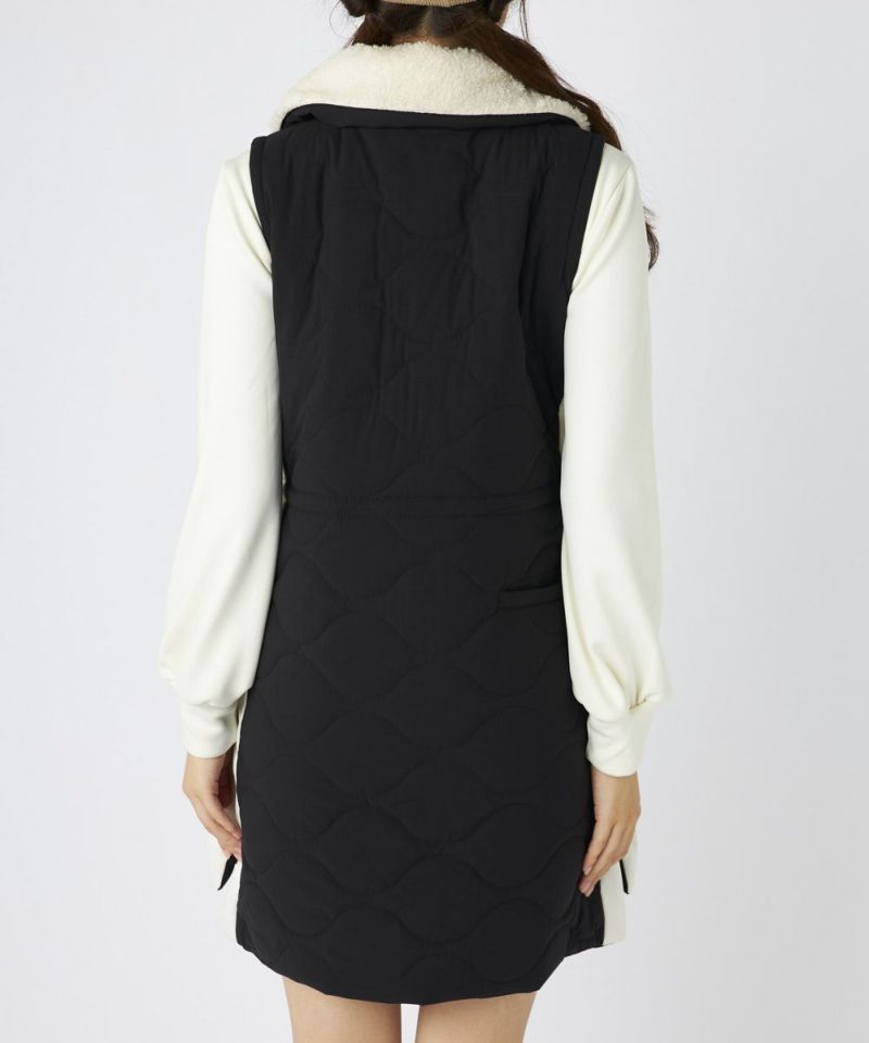 柔らかなキルト加工が上品な印象を演出し、衿元のボアが優しく可愛らしいアクセントを添えます。フルジップ仕様で着脱もスムーズ。ウエストは内側のスピンドルで調整可能なため、好みのシルエットでスタイルアップ効果も期待できます。
