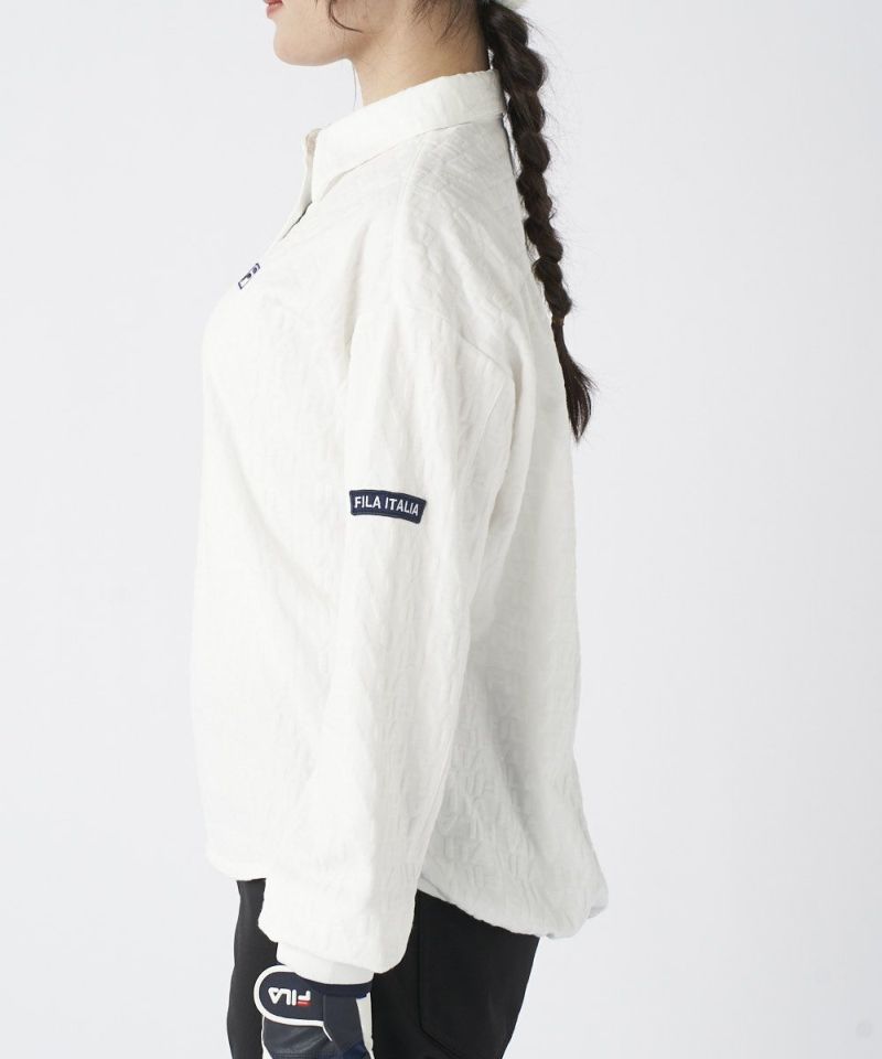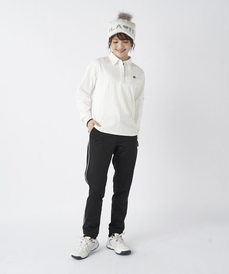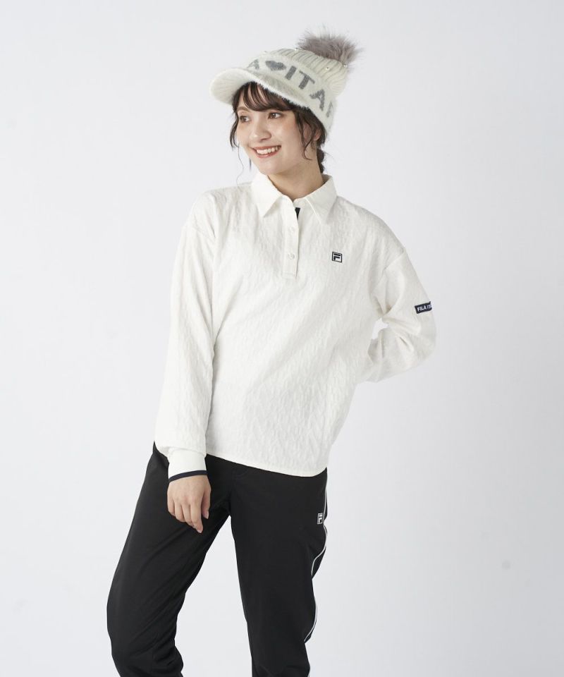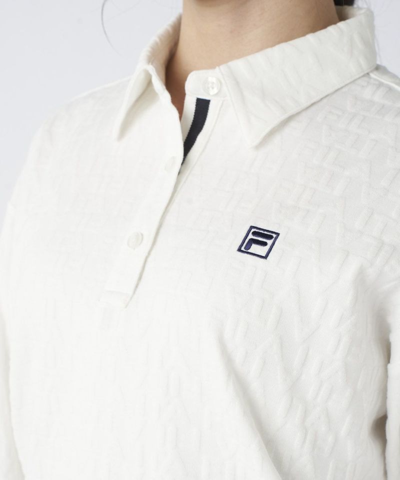 編地で表現されたロゴ柄が、シンプルになりすぎず、おしゃれなアクセントをプラスします。後ろ裾のギャザーデザインがシルエットに女性らしい丸みを加え、緩やかなラウンドヘムが柔らかな印象を演出。袖口のリブデザインもスポーティなポイントとなり、大人のクリーンなゴルフスタイルを完成させます。