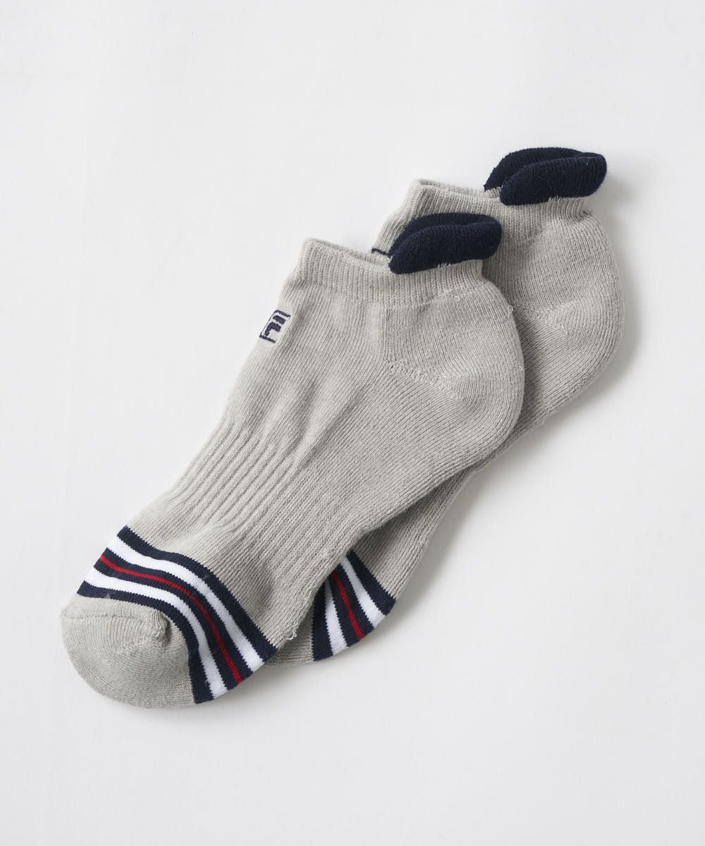 シューズから絶妙に覗くスニーカー丈設計。足首周りをすっきりと見せつつ、しっかりとしたフィット感でズレを防ぎます。FILAらしいワンポイントやライン使いが、シューズを脱いだ瞬間にも洗練された印象を与えます。