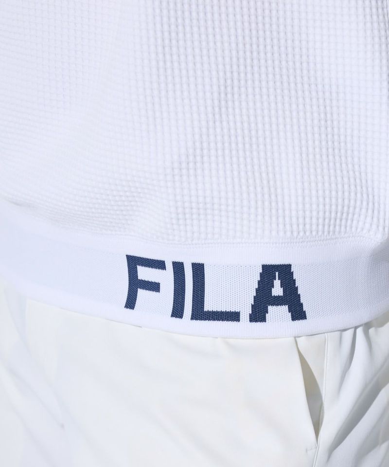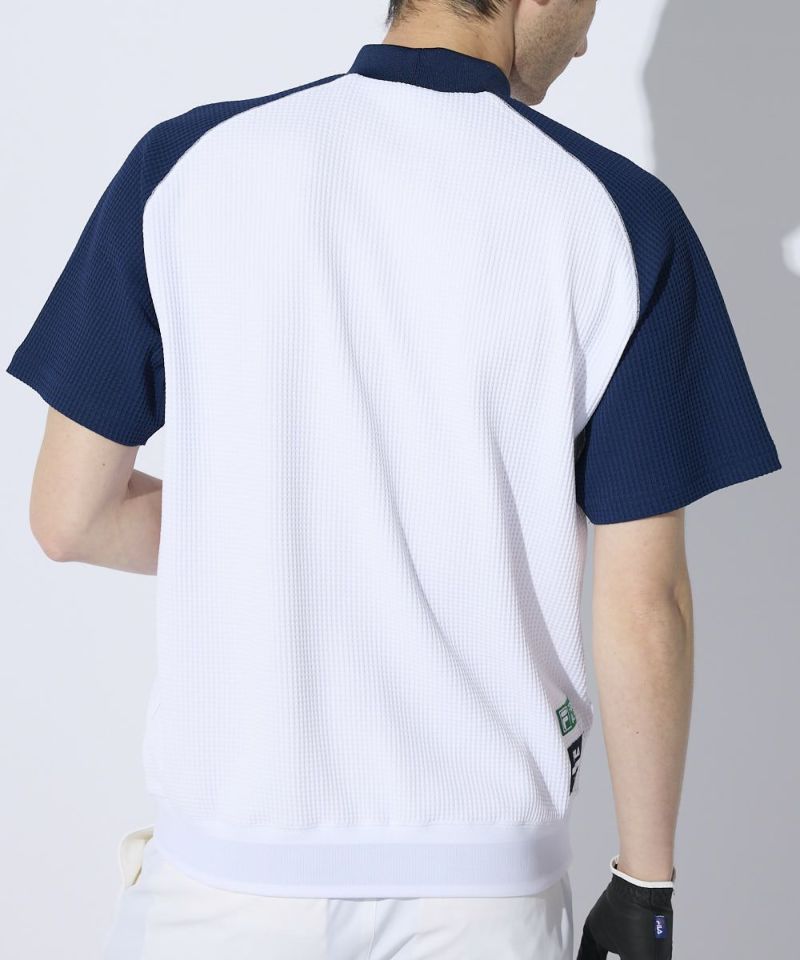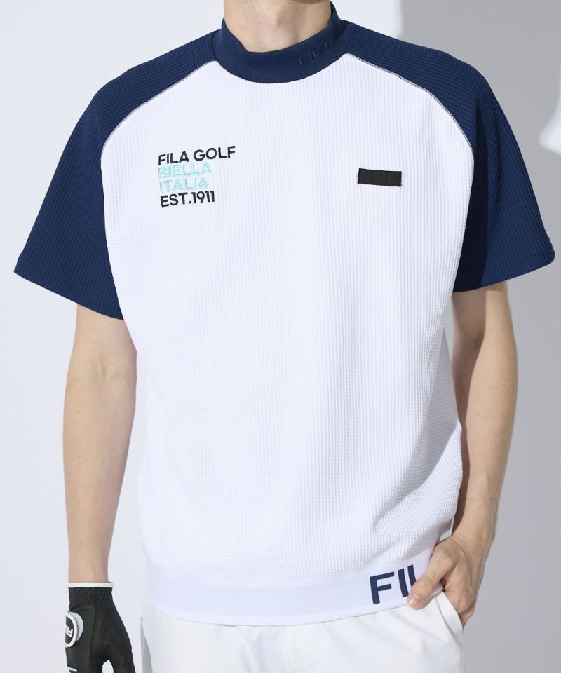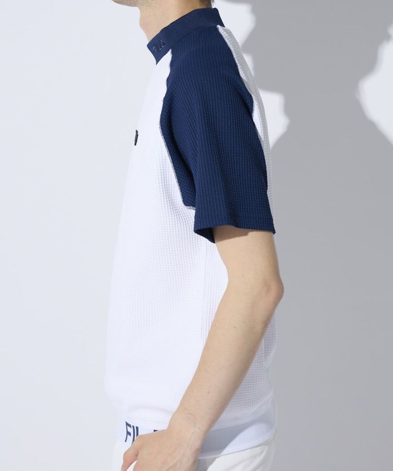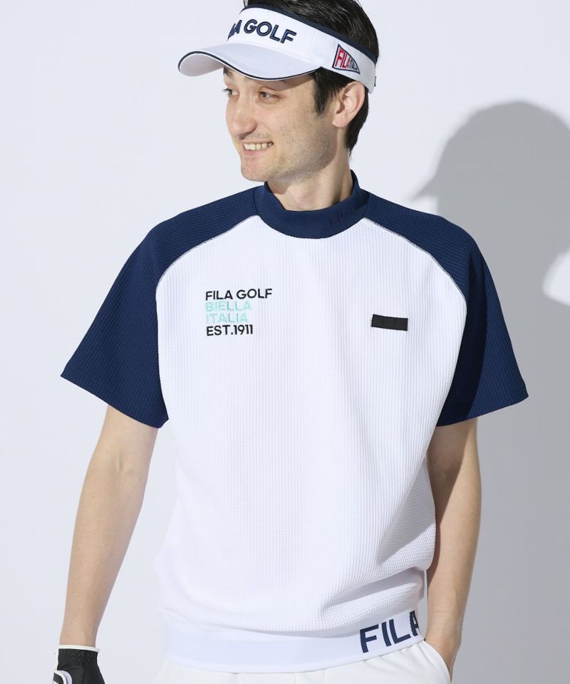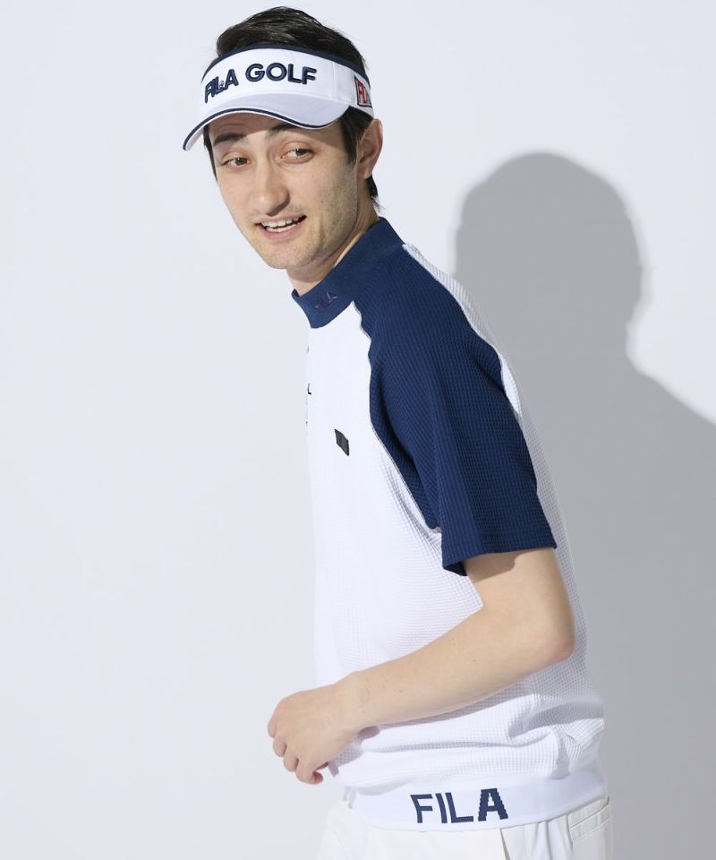 表面感のあるやわらかいワッフル素材を使用したモックネックシャツ。一枚でもインナーでも着用できる汎用性の高いアイテムです。また、ラグランパターンで動きやすい!裾は風が入りにくいリリブ仕様になっており、FILAのロゴをあしらい細部までこだわった一枚です。胸に便利なティーホルダー付き。●機能性・UVカット・吸汗速乾・ティーホルダー付き