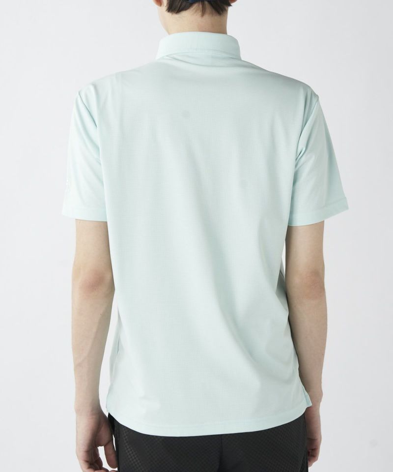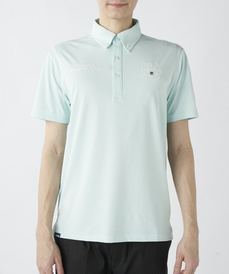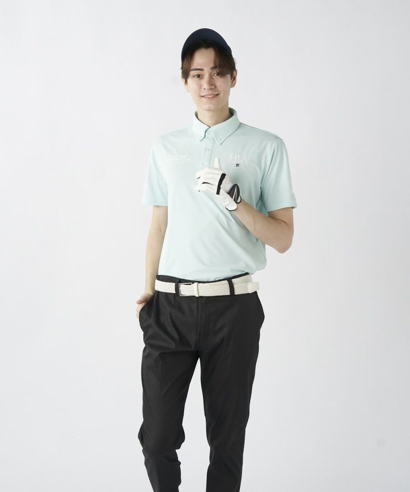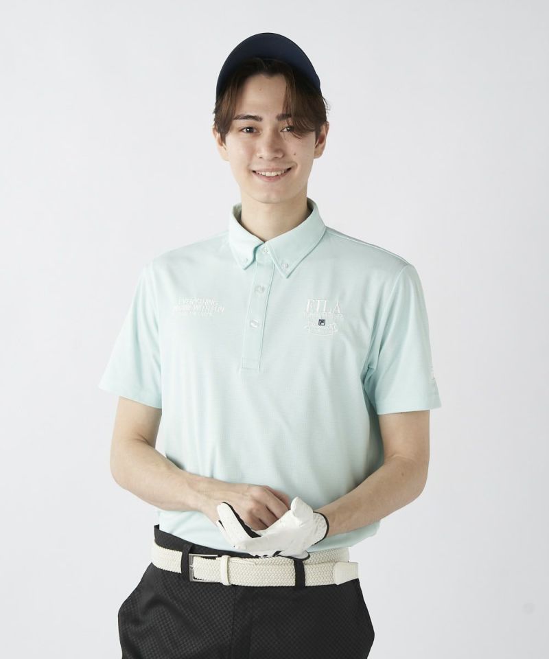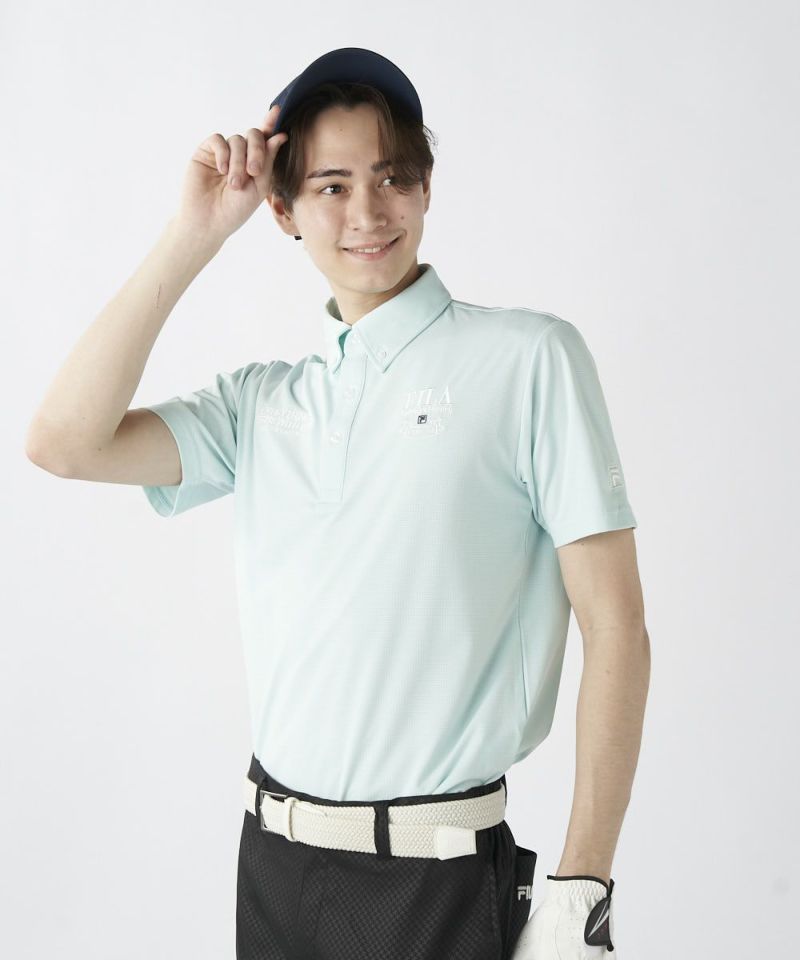 半袖のボタンダウンシャツ。両胸のロゴとテキストデザインがおしゃれな半袖シャツです。吸汗速乾/UV、ストレッチ機能付き。遮熱素材で猛暑対策もばっちり!汗をかいても快適にゴルフを楽しめます。