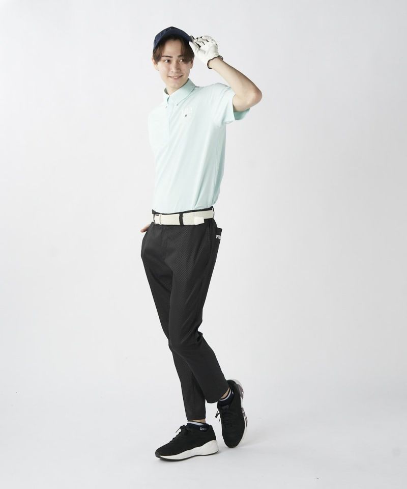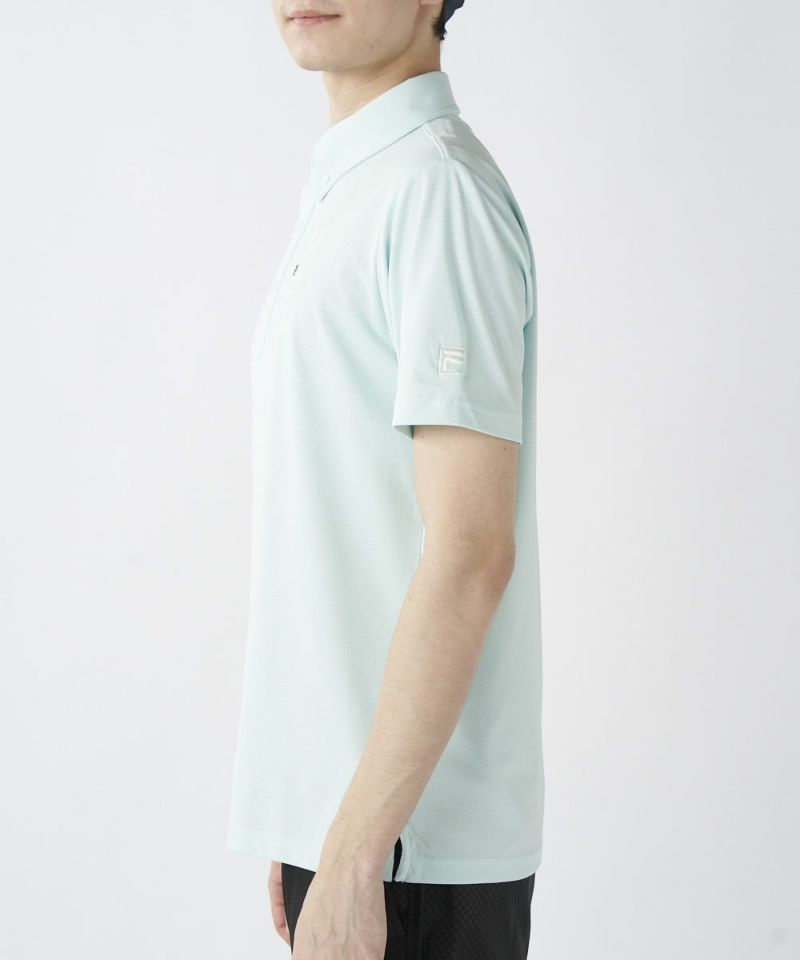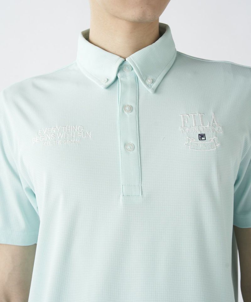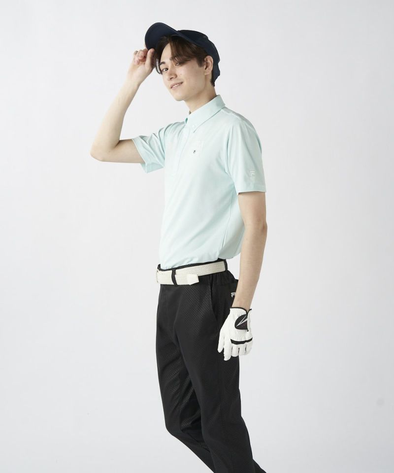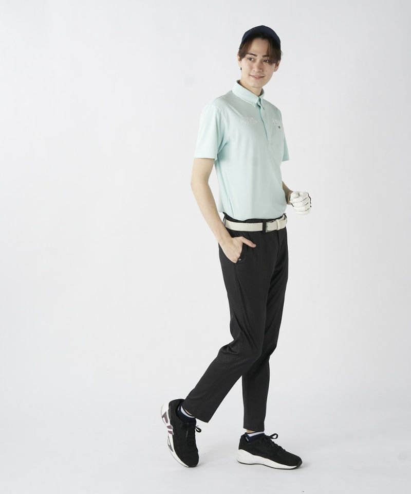 半袖のボタンダウンシャツ。両胸のロゴとテキストデザインがおしゃれな半袖シャツです。吸汗速乾/UV、ストレッチ機能付き。遮熱素材で猛暑対策もばっちり!汗をかいても快適にゴルフを楽しめます。