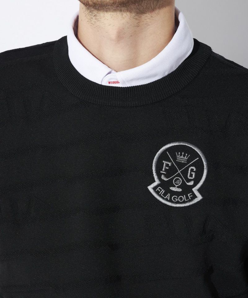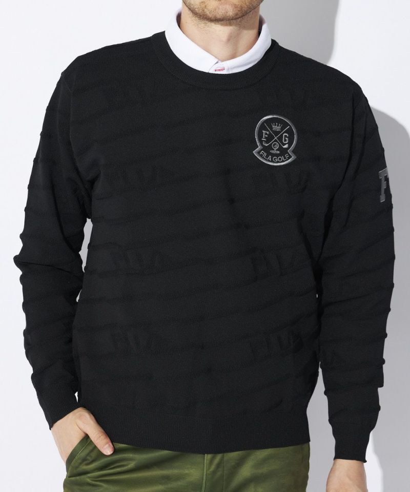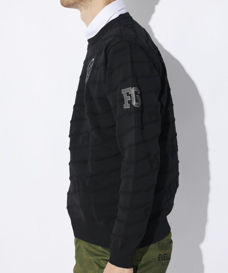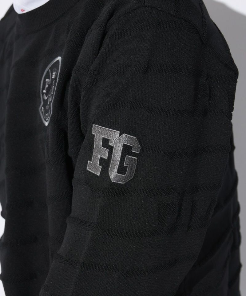 エコに配慮したリサイクル糸を使用。軽くて動きやすいポリエステルニット素材の丸首セーター。天竺と鹿の子で編み立てた1トーンのシンプルで着やすいアイテムです。エンブレム刺繍とFGモチーフが入ります。