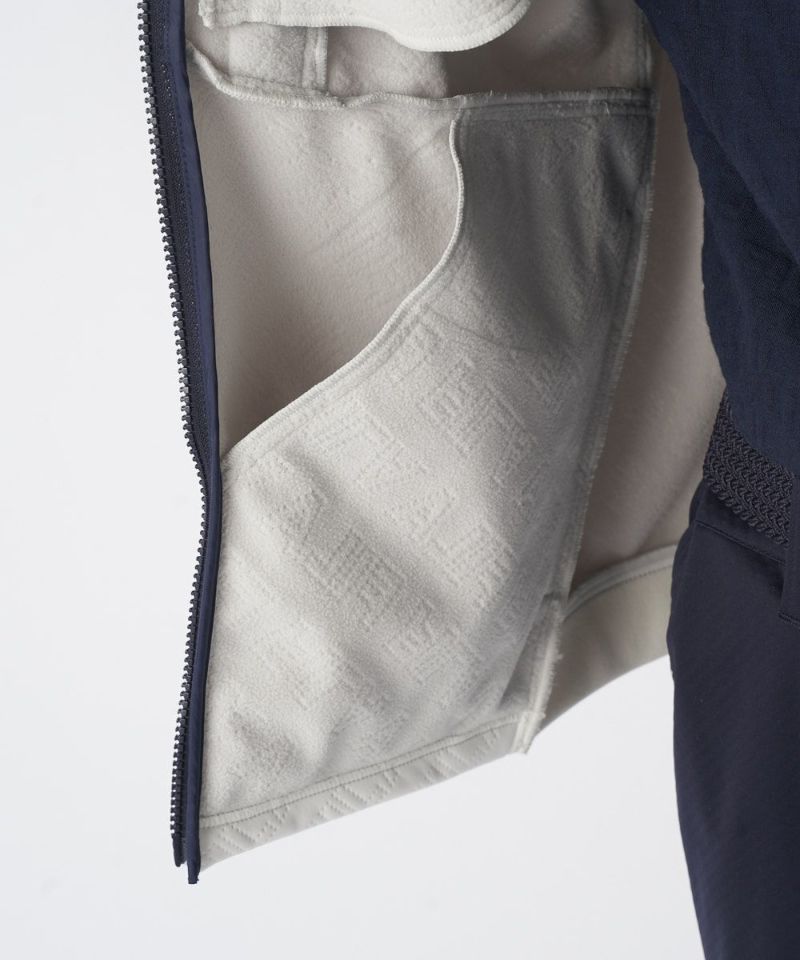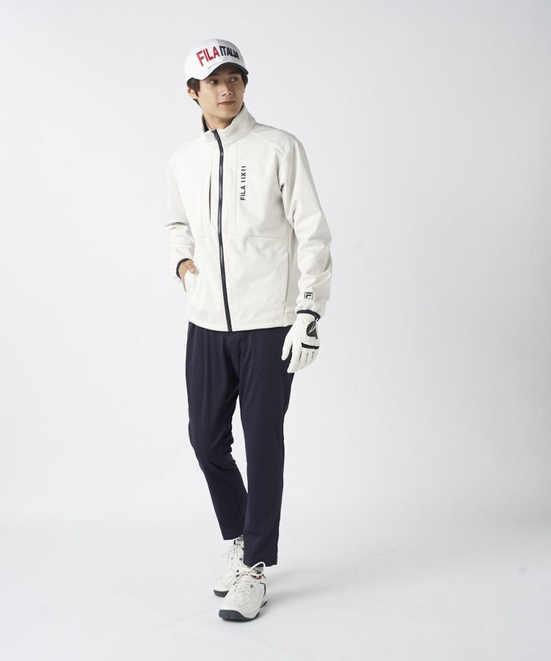 ストレッチ性の高いFILAオリジナル柄でキルティングを施した3層ボンディング素材を使用。外からの冷たい風を防ぐ防風機能と、体温を逃さない保温性を両立。ボンディング特有のハリがありながら、高いストレッチ性がダイナミックなスイングをサポートし、プレー中のストレスを軽減します。軽快で暖かい、秋冬に最適な素材です。