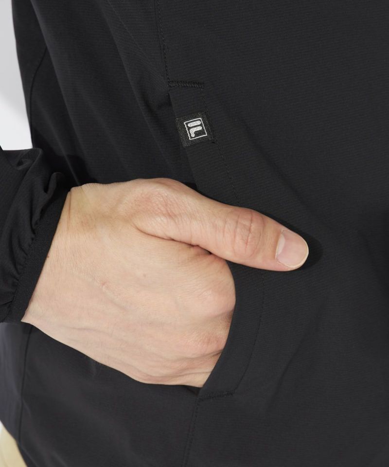 撥水ストレッチ生地と防風性の高いタフタ素材を組み合わせたハイブリッド構造。風雨から身体を守り、常に快適なコンディションをキープします。高いストレッチ性が、動きのストレスを軽減し、アクティブなプレーをサポートします。
