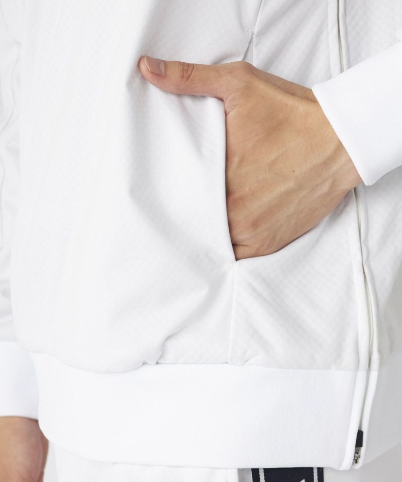 極薄素材に防風フィルムとメッシュをボンディングした**「ウインドガードライト」素材を使用。驚異の4WAYストレッチ機能で、ダイナミックなスイングもストレスなくサポートします。軽量性と確かな防風性**を兼ね備え、肌寒くなる季節のゴルフに最適な、軽やかに羽織れるアイテムです。
