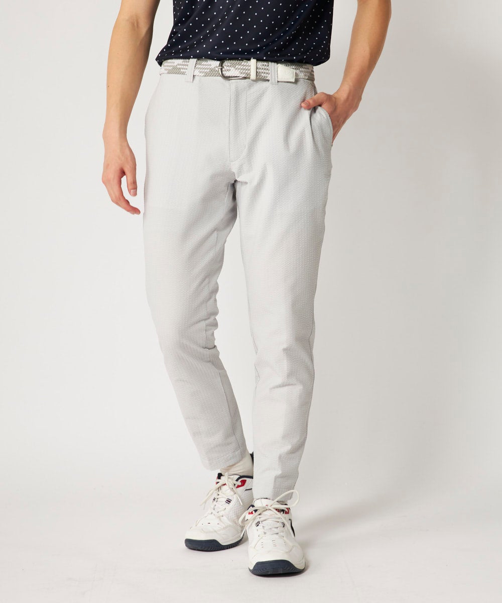 腰回りに適度なゆとりを持たせながら、裾に向かって細くなる「テーパードシルエット」を採用。スッキリと洗練されたラインが、脚長効果とスマートな佇まいを演出します。サッカー素材特有のナチュラルなシワ感が、大人の余裕を感じさせるスポーティーかつ都会的な表情に仕上げました。