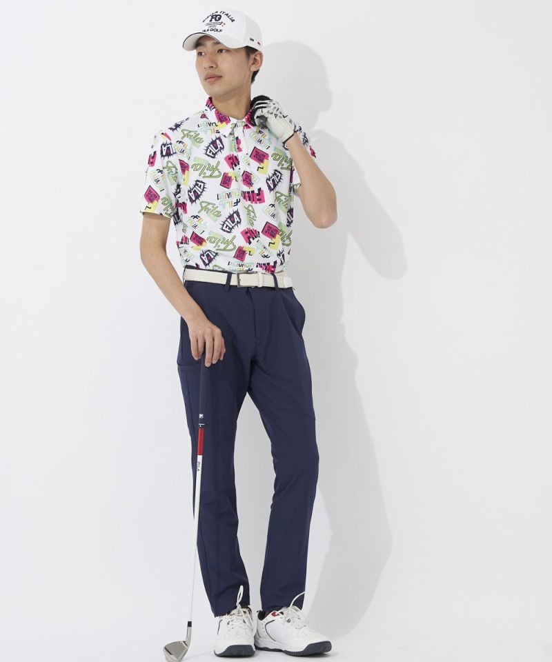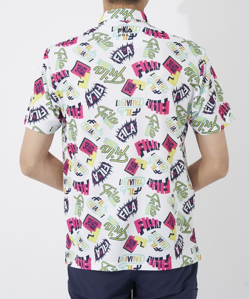 FILA GOLFらしいPOPな柄がアクセントになった半袖シャツが登場。春夏らしいタイポコミック柄のカラーリングがおしゃれな一枚。また、衿付けのヘリテージストライプテープがアクセントに。裾にスリットを付けることで、着用時にお腹周りのシワを軽減。吸汗速乾、UVカットの機能付き生地で、夏場でも快適にプレーを行っていただけます。