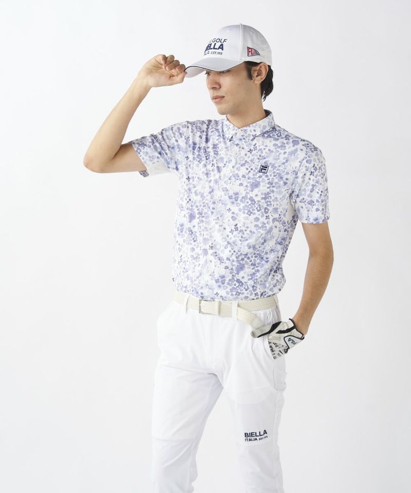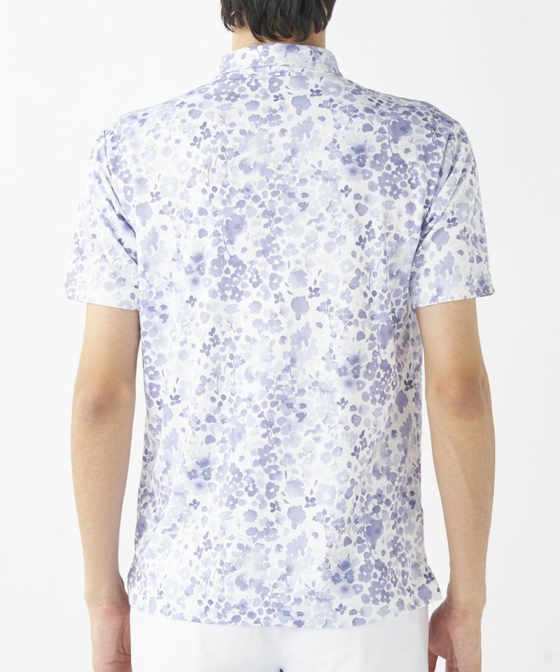 ぼかし花柄がおしゃれな半袖シャツ。吸汗速乾素材で、汗をかいてもさらっとしていて着やすいポロシャツです。シンプルなパンツとの相性がよく、コーディネートの幅も広がります。おしゃれな柄なので、ゴルフ場でも映える一枚です!