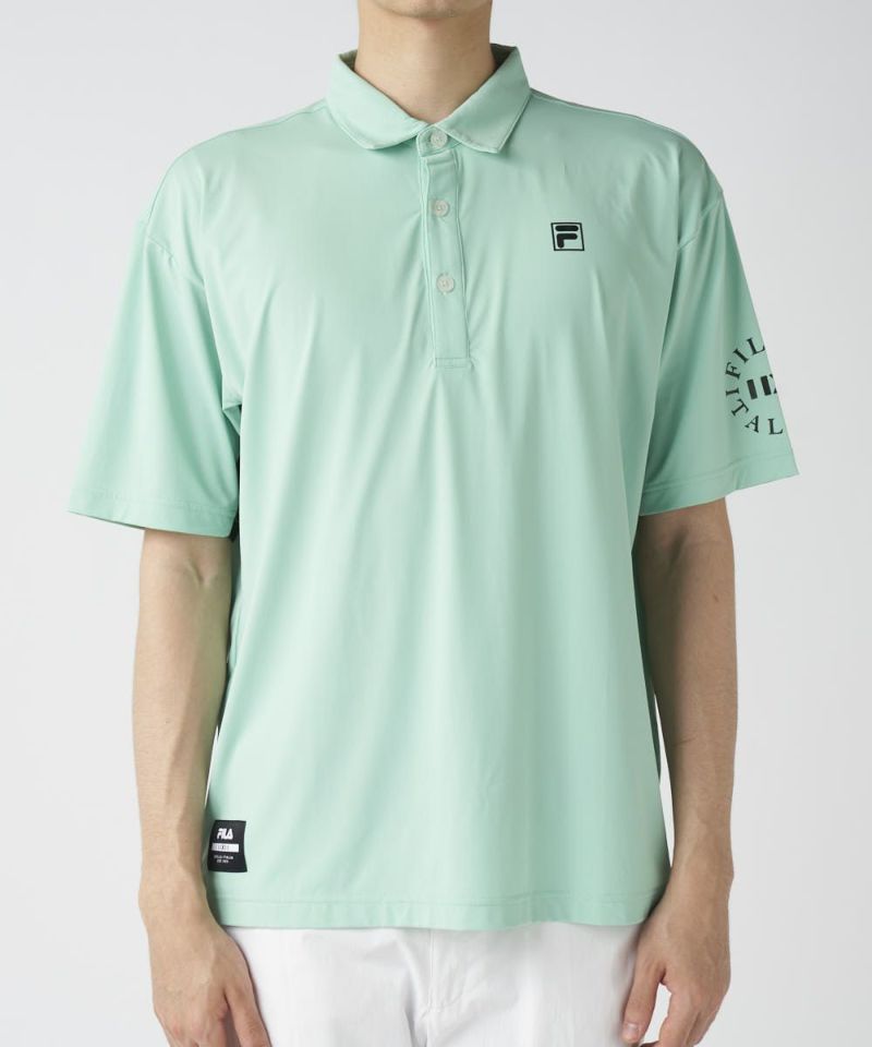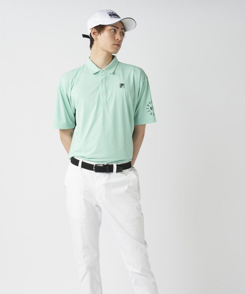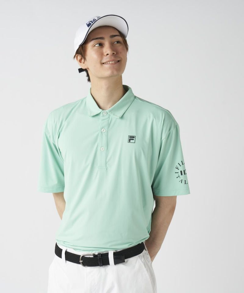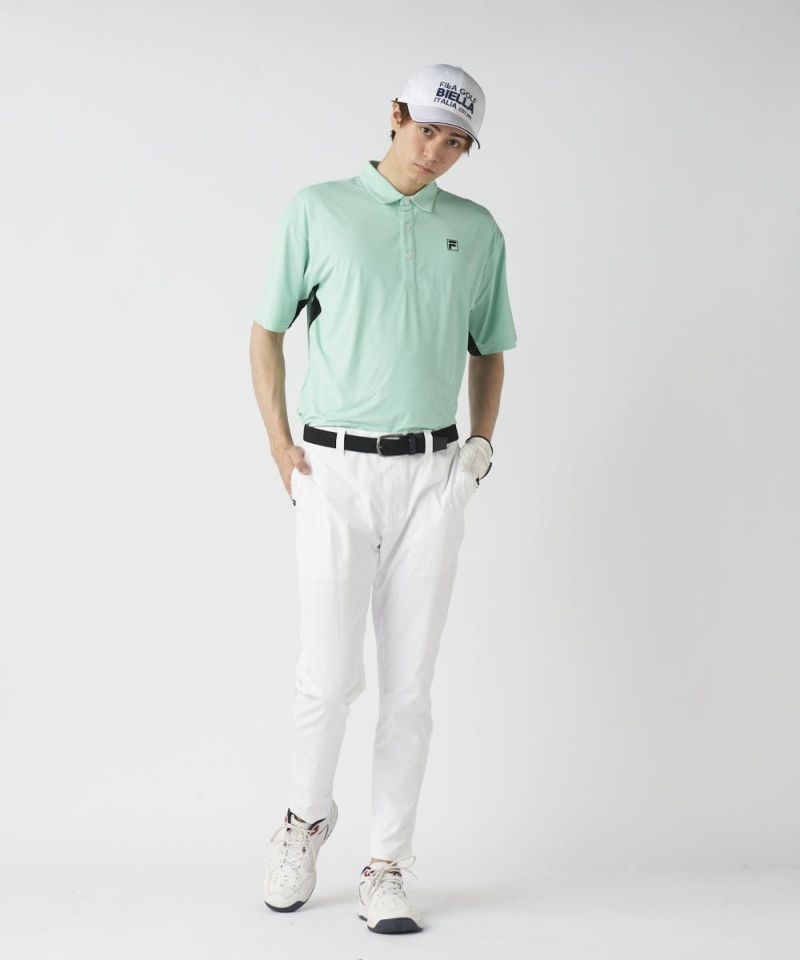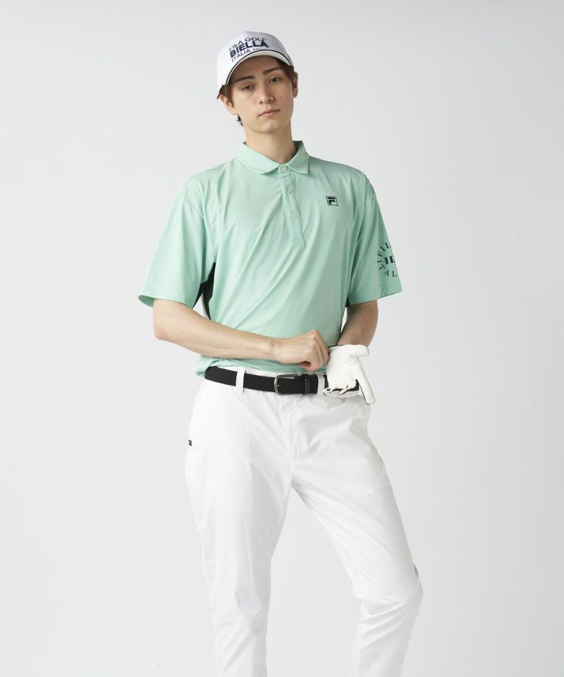 脇の切り替えと、バックプリントが特徴のポロシャツ。シンプルにショートパンツで合わせるスタイルがおすすめです!接触冷感機能付きで、夏ゴルフも快適に楽しめます。