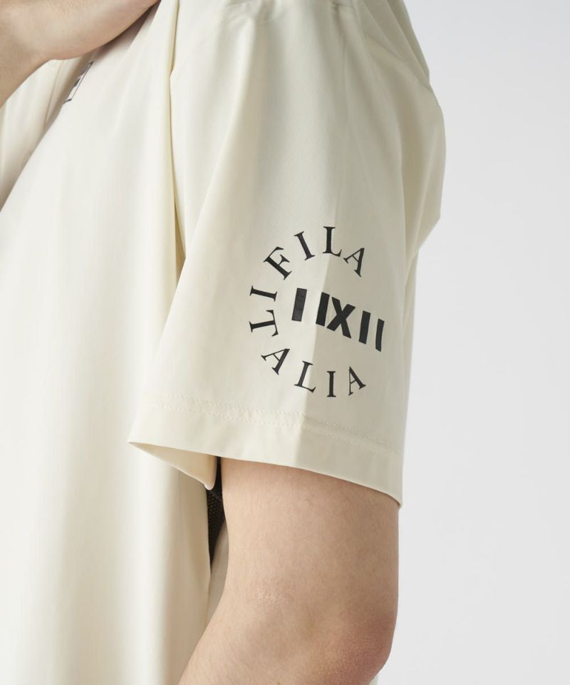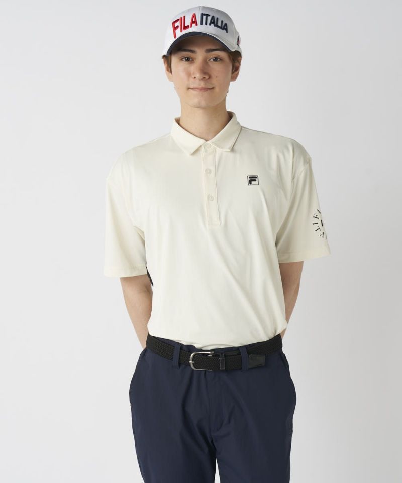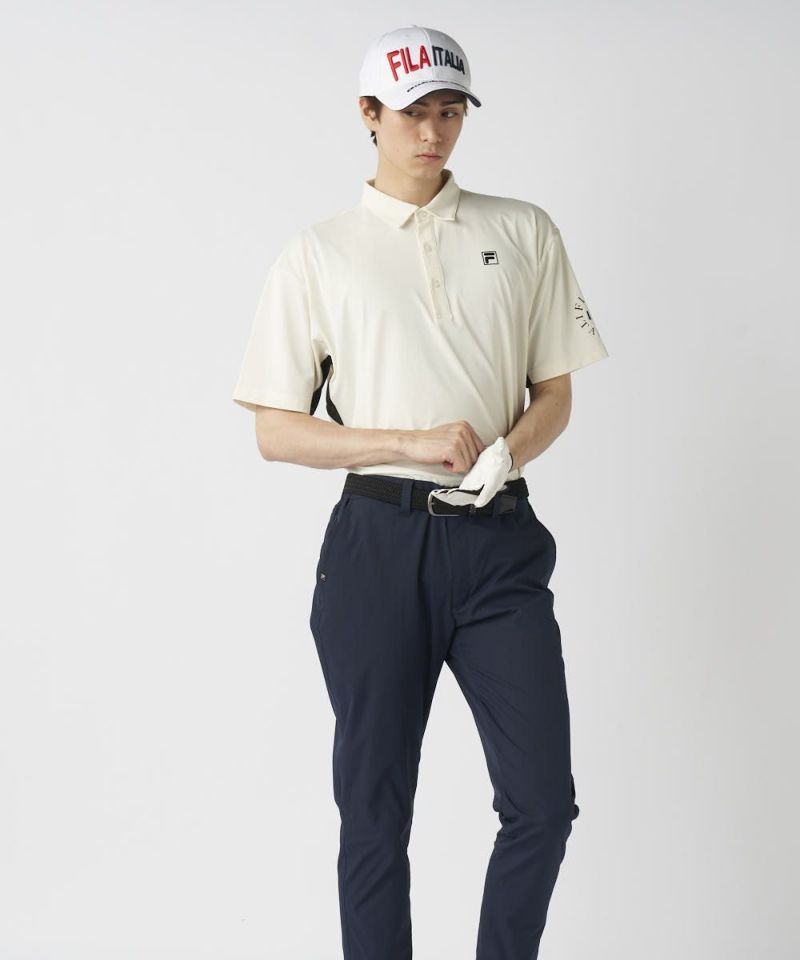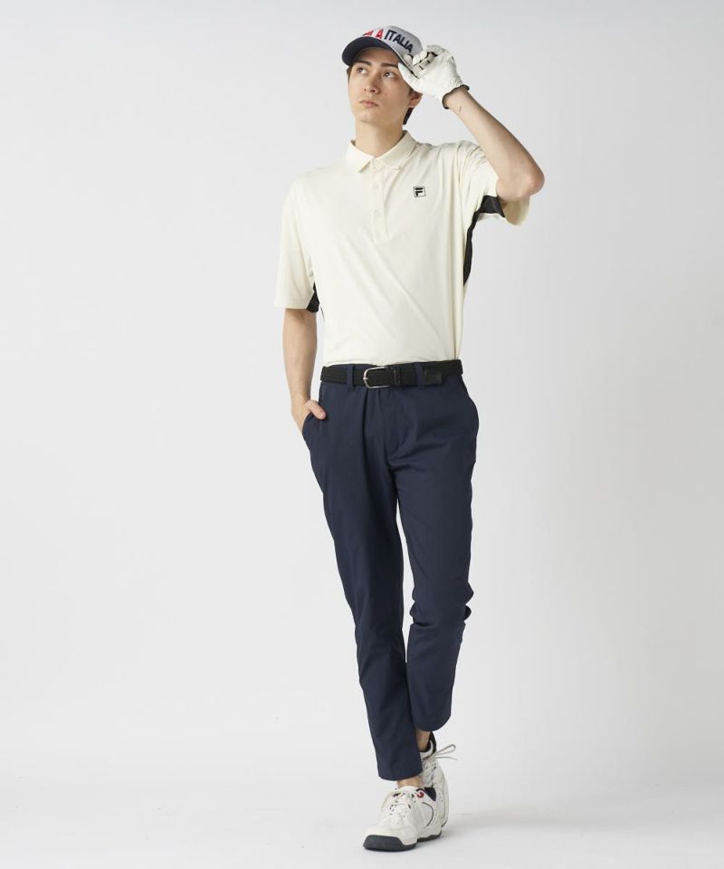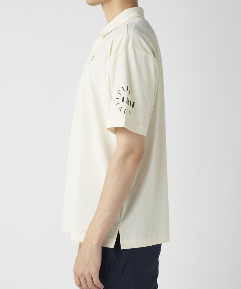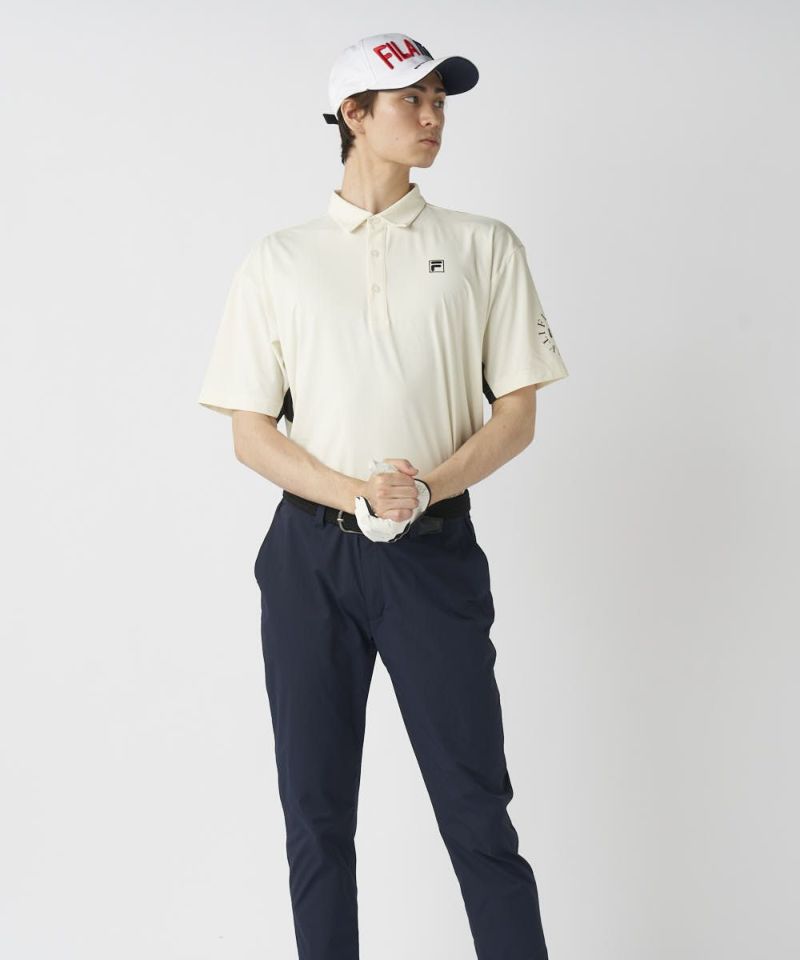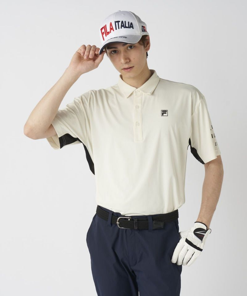 脇の切り替えと、バックプリントが特徴のポロシャツ。シンプルにショートパンツで合わせるスタイルがおすすめです!接触冷感機能付きで、夏ゴルフも快適に楽しめます。