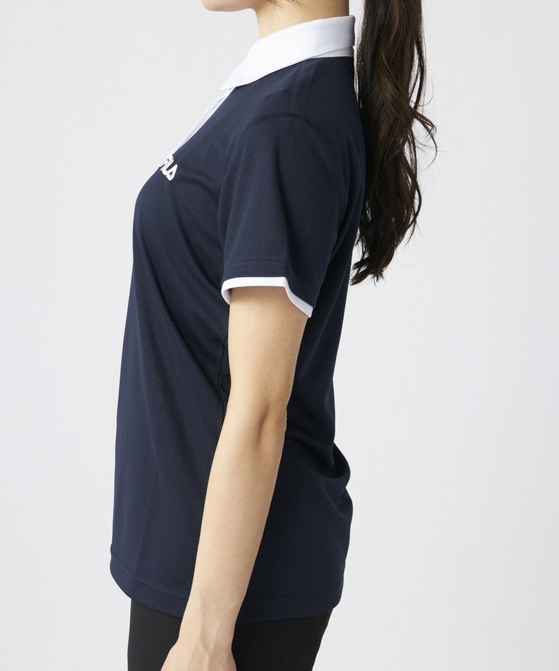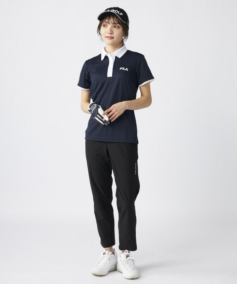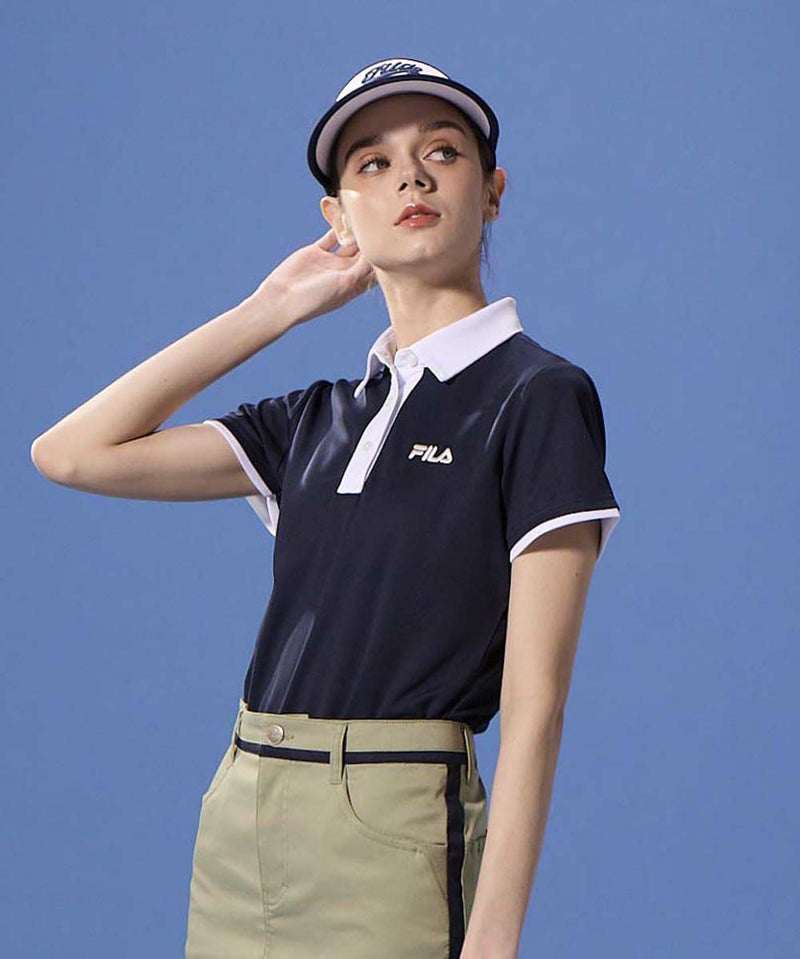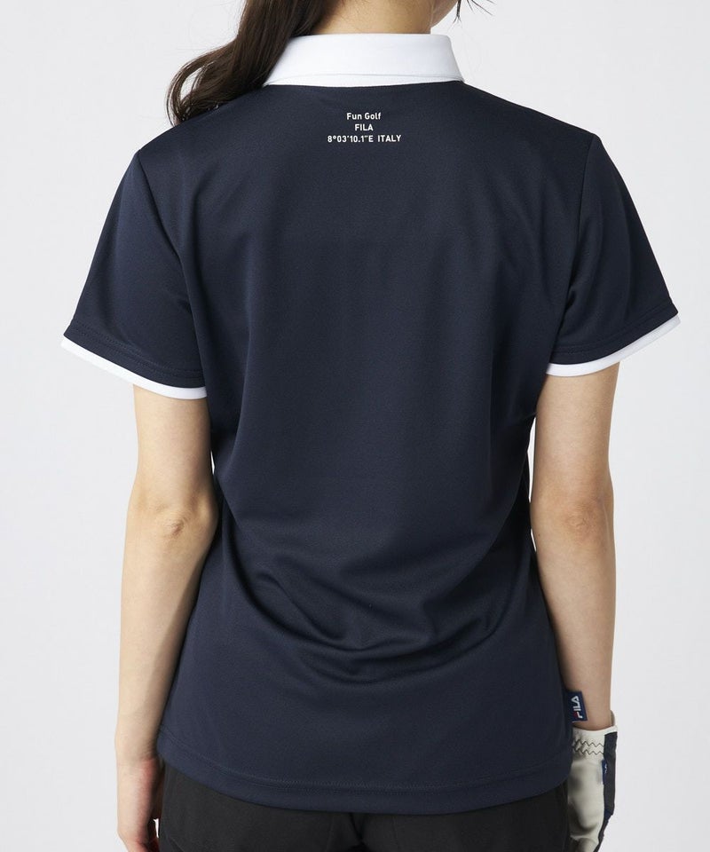 衿のバイカラーがかわいい半袖ポロシャツ。ベーシックなデザインなので、スカート、パンツ選ばずコーディネートを楽しめます。程よい丈感で、アウトでもインでもバランスよく着用いただけます。バックデザインにはフィラゴルフのキャッチコピー【Fun Golf】のテキストを小さく入れており、細部までこだわったオシャレなデザインです。