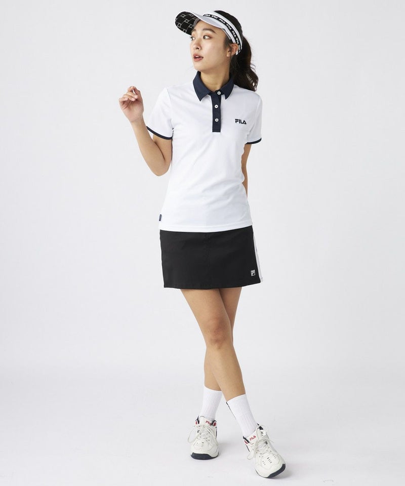 衿のバイカラーがかわいい半袖ポロシャツ。ベーシックなデザインなので、スカート、パンツ選ばずコーディネートを楽しめます。程よい丈感で、アウトでもインでもバランスよく着用いただけます。バックデザインにはフィラゴルフのキャッチコピー【Fun Golf】のテキストを小さく入れており、細部までこだわったオシャレなデザインです。