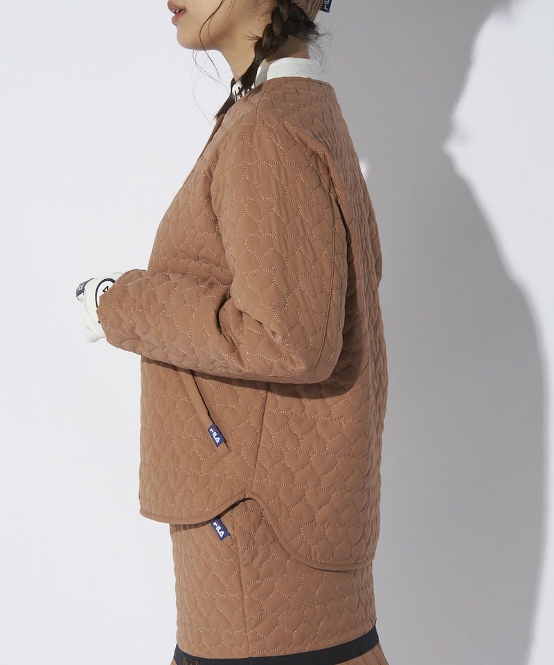 ハートのキルト柄がキュートな中綿入りブルゾン。カーディガンタイプなので、さっと羽織れてます!モックネックやフーディーとの相性の良いノーカラータイプ。