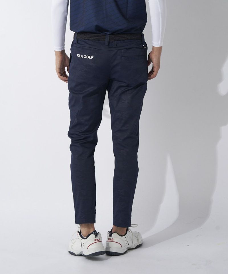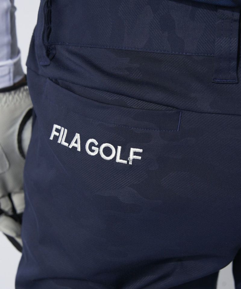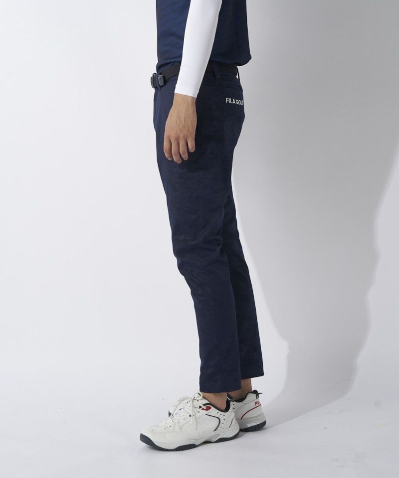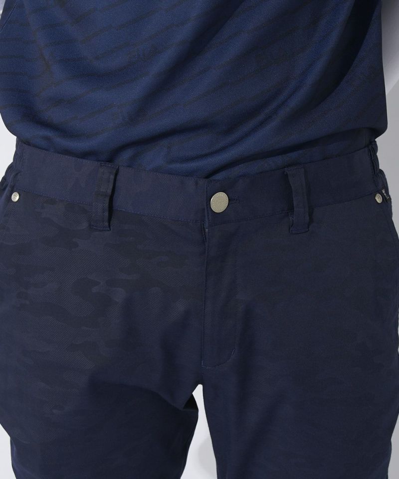 ストレッチの効いた軽量ツイル素材にエンボスでカモ柄を入れたパンツは、ゆったりと履けるシャーリング仕様。
