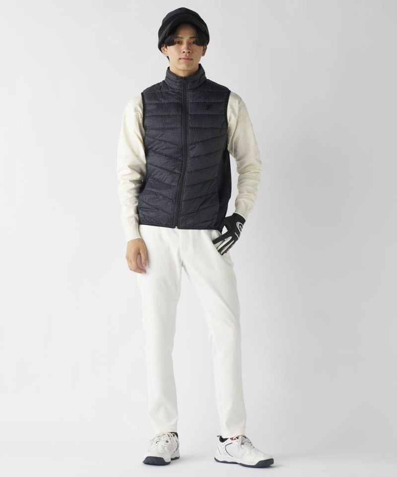 中綿に天然ダウンと高機能ファイバーダウンをブレンドしたハイブリッド中綿を採用。軽量でありながら高い保温力で、体の中心部を効率よく暖めます。撥水加工により、霧や小雨にも対応し、濡れにくく乾きやすいのでお手入れも容易です。脇部分にはストレッチ素材を使用し、腕の可動域を最大化し、スイングを妨げません。