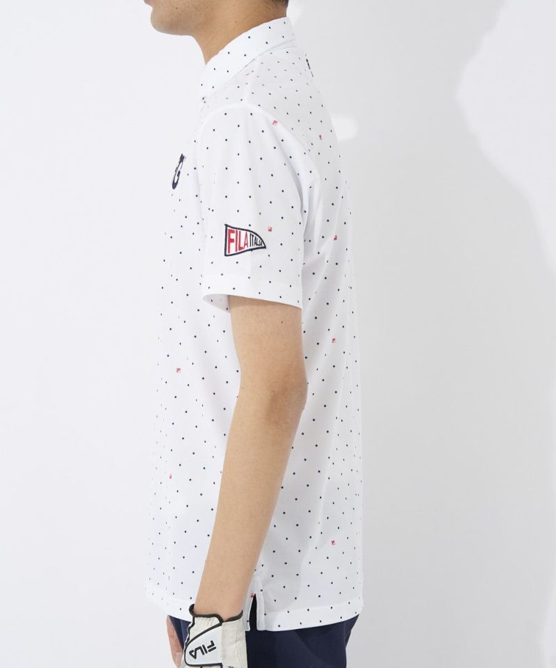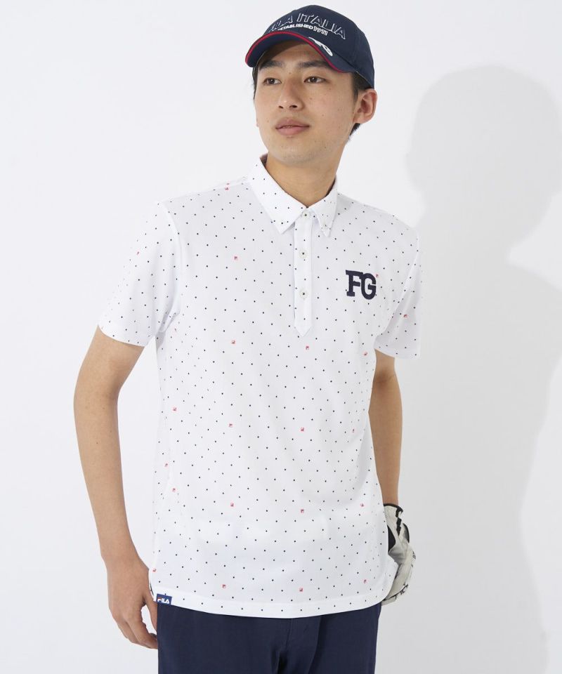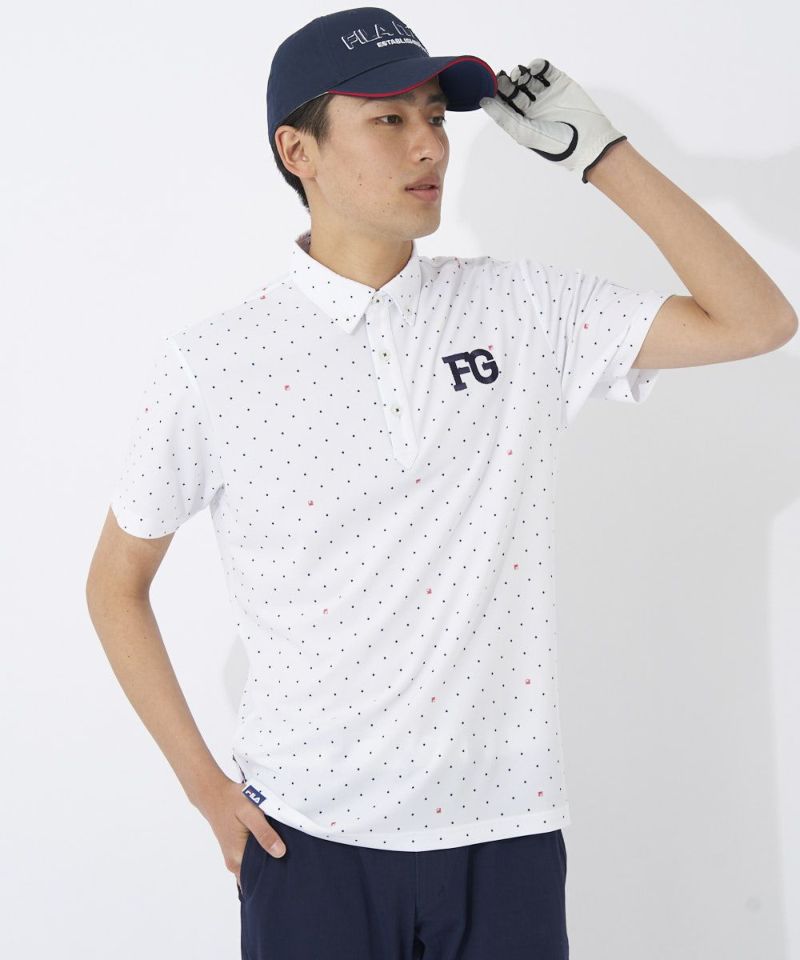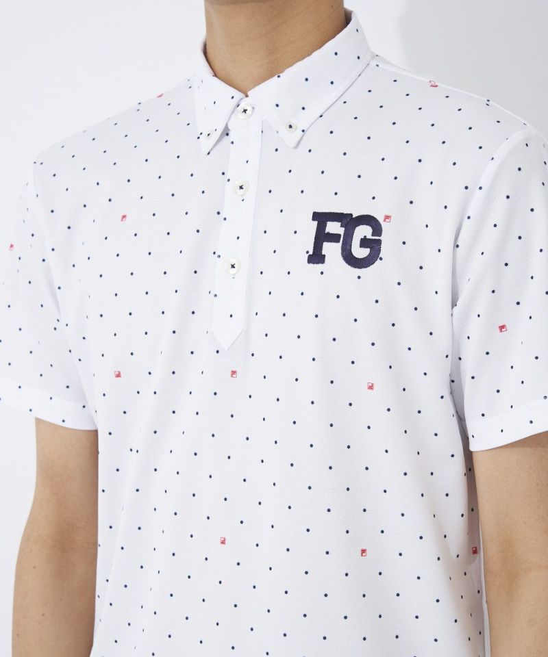 夏をイメージさせるドット柄は、シンプルで合わせやすい半袖シャツに。また、胸元にFG刺繍と左袖にオリジナルカートモチーフ刺繍が入ることで、シンプル過ぎないデザインに仕上がりました。リサイクル素材のカノコを使用することで、夏場でも涼しく過ごせます。裾にスリットを付けて着用時にお腹周りのシワを軽減させます。