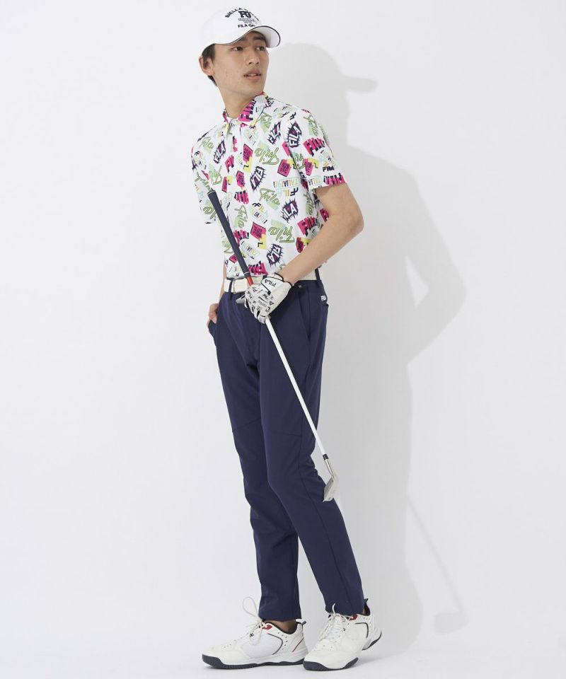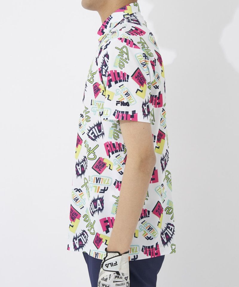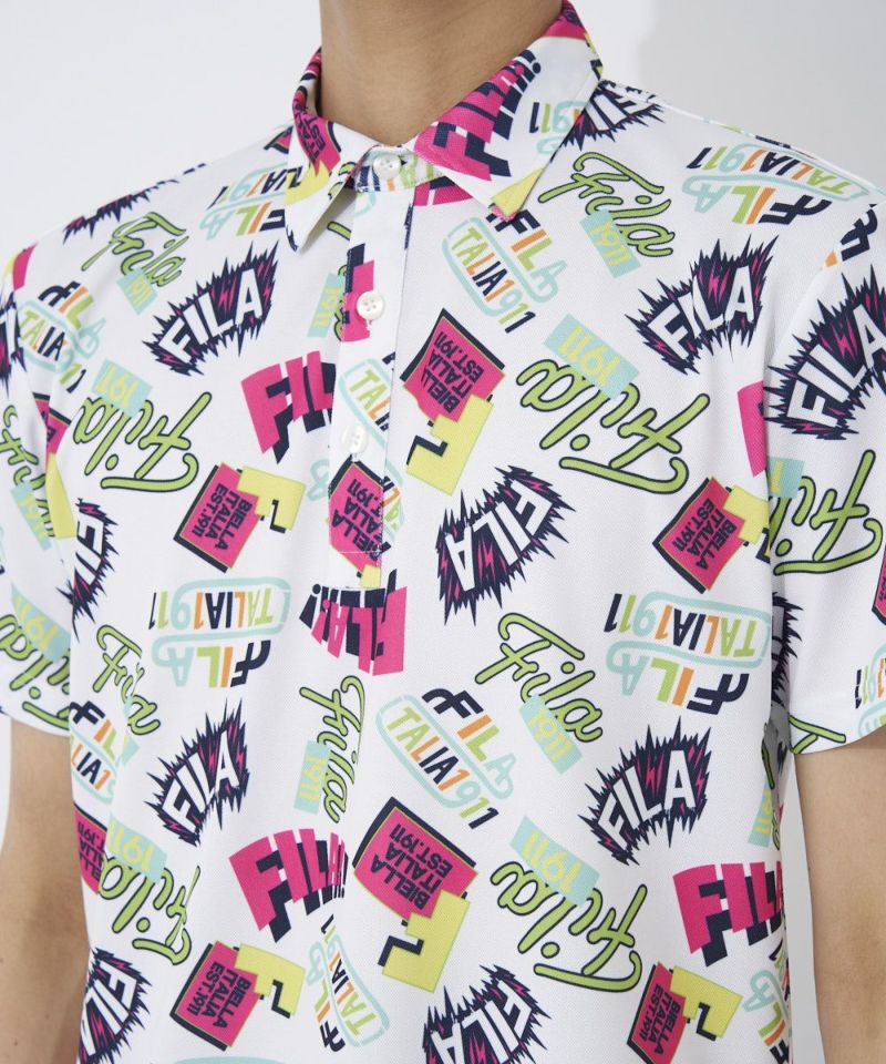 FILA GOLFらしいPOPな柄がアクセントになった半袖シャツが登場。春夏らしいタイポコミック柄のカラーリングがおしゃれな一枚。また、衿付けのヘリテージストライプテープがアクセントに。裾にスリットを付けることで、着用時にお腹周りのシワを軽減。吸汗速乾、UVカットの機能付き生地で、夏場でも快適にプレーを行っていただけます。