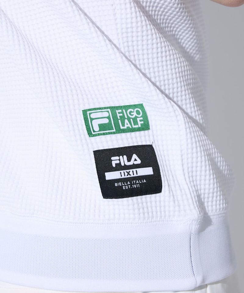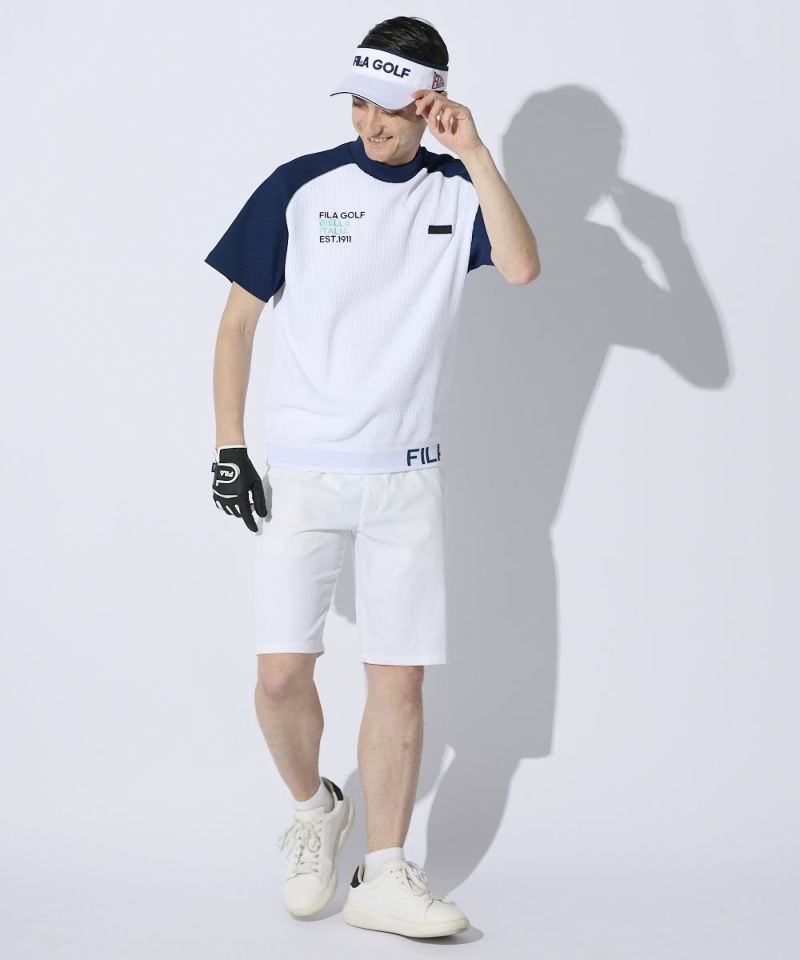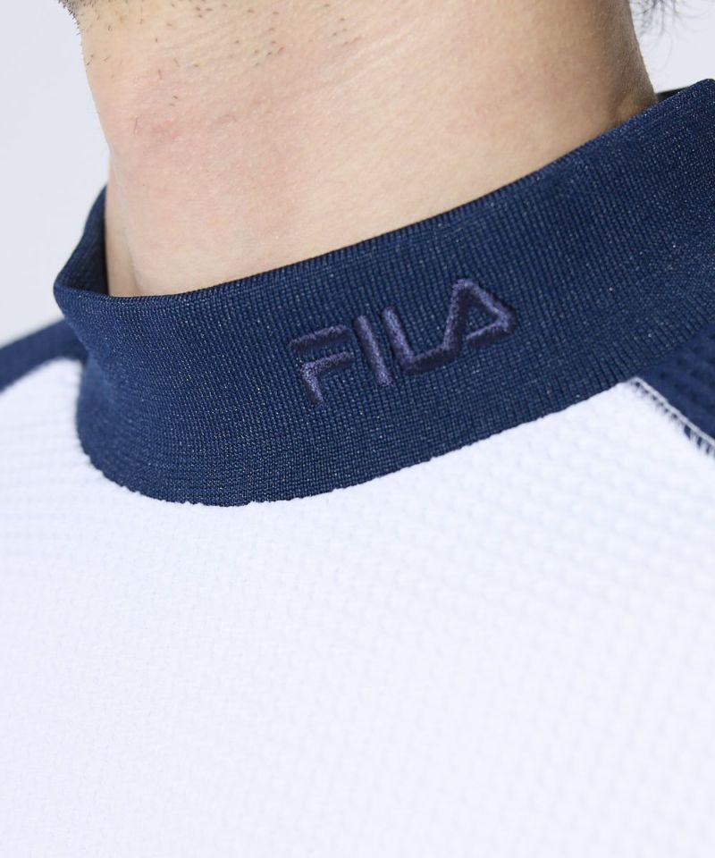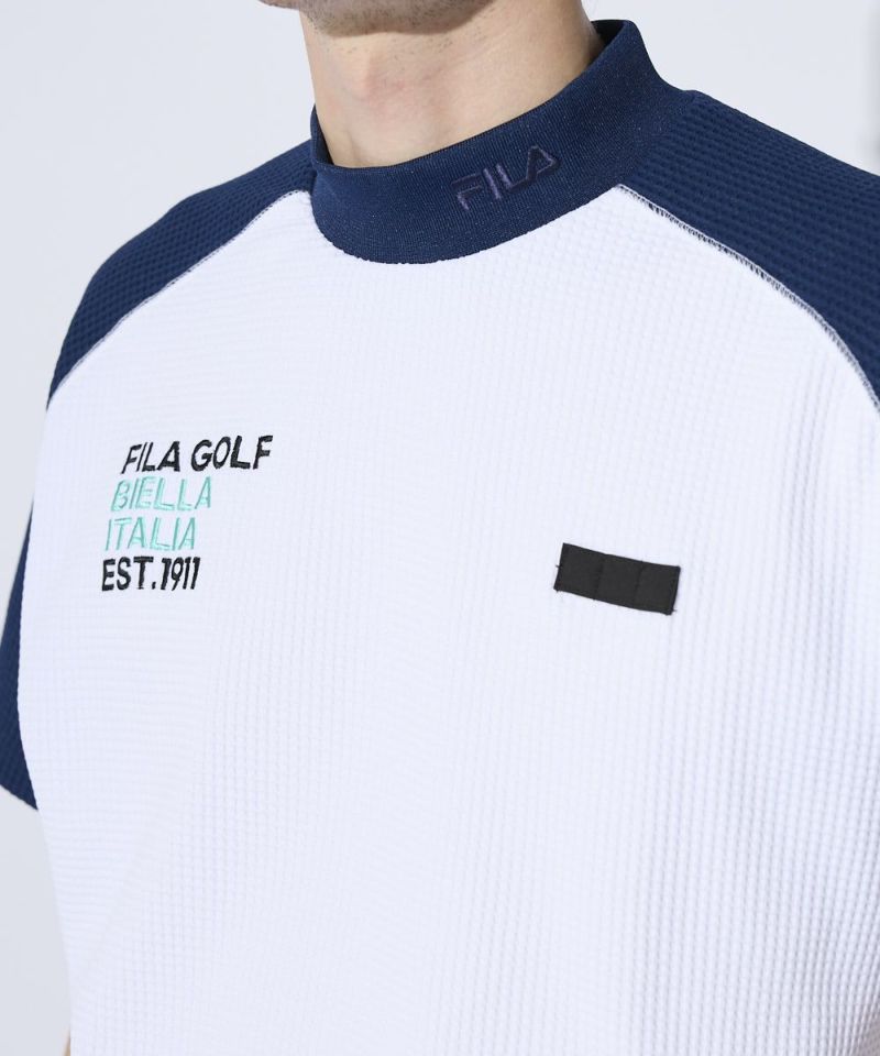 表面感のあるやわらかいワッフル素材を使用したモックネックシャツ。一枚でもインナーでも着用できる汎用性の高いアイテムです。また、ラグランパターンで動きやすい!裾は風が入りにくいリリブ仕様になっており、FILAのロゴをあしらい細部までこだわった一枚です。胸に便利なティーホルダー付き。●機能性・UVカット・吸汗速乾・ティーホルダー付き
