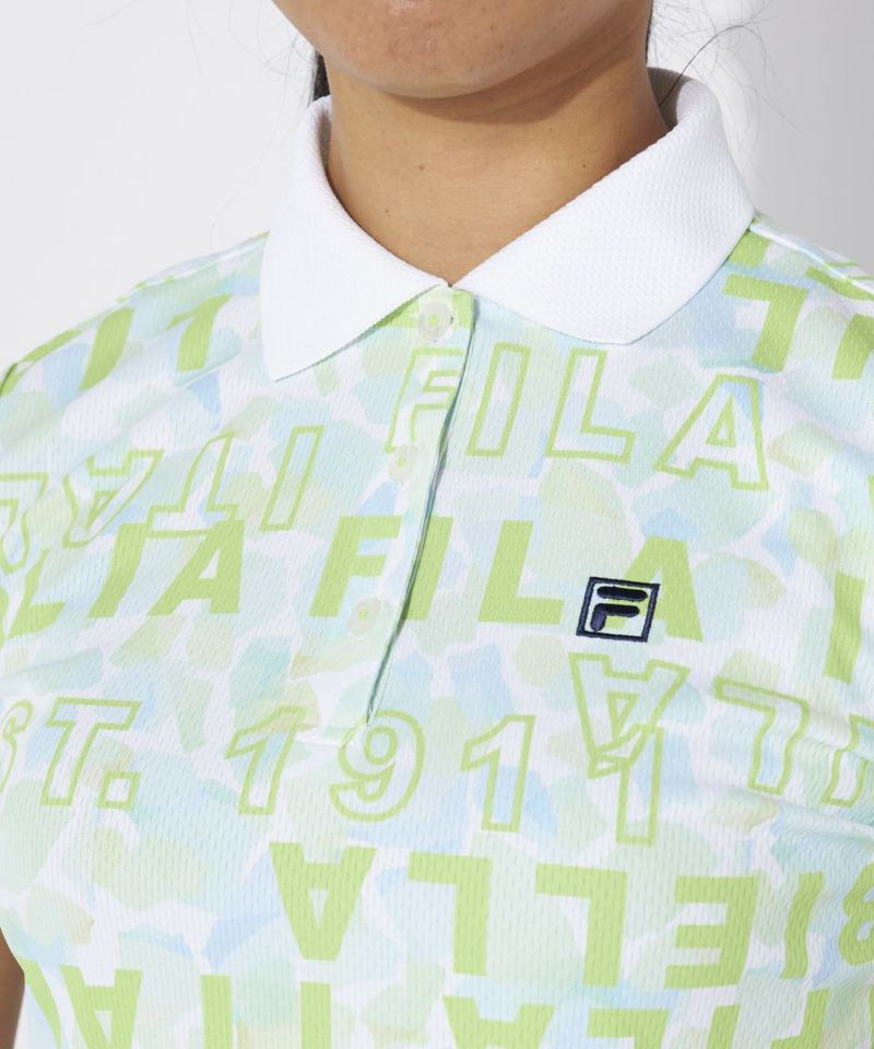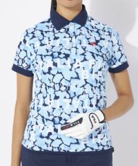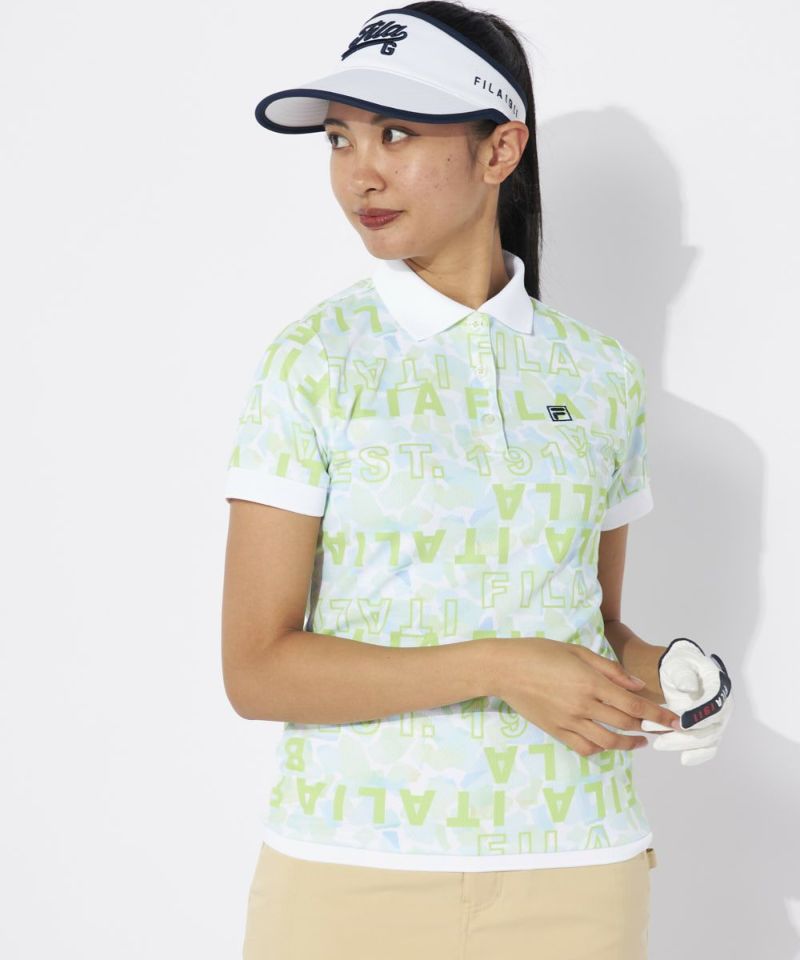 春らしい色合いのモザイクにタイポ柄を重ねたプリント柄のシャツ。裾口リブ仕様のオーバーブラウスタイプ。吸汗速乾、UV、遮熱や接触冷感など、機能たっぷり素材を使用。