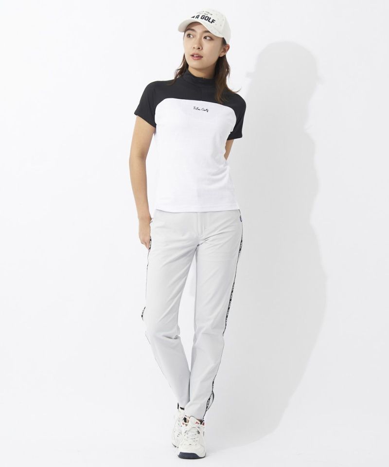 動きやすい変形ラグランスリーブシャツ。脇線を前側に寄せることで、細見せ効果を持たせました。FILAロゴをジャガードで表現したストレッチ性の良い素材を採用。