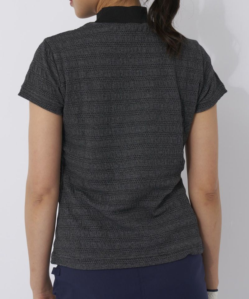 ジャガードでグラフィックを表現したリブ衿が特徴のモックネックシャツ。杢調の、シャーリングがかかった特徴的な素材を採用。