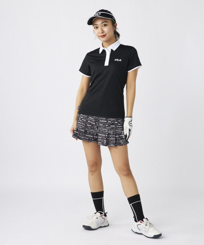 衿のバイカラーがかわいい半袖ポロシャツ。ベーシックなデザインなので、スカート、パンツ選ばずコーディネートを楽しめます。程よい丈感で、アウトでもインでもバランスよく着用いただけます。バックデザインにはフィラゴルフのキャッチコピー【Fun Golf】のテキストを小さく入れており、細部までこだわったオシャレなデザインです。