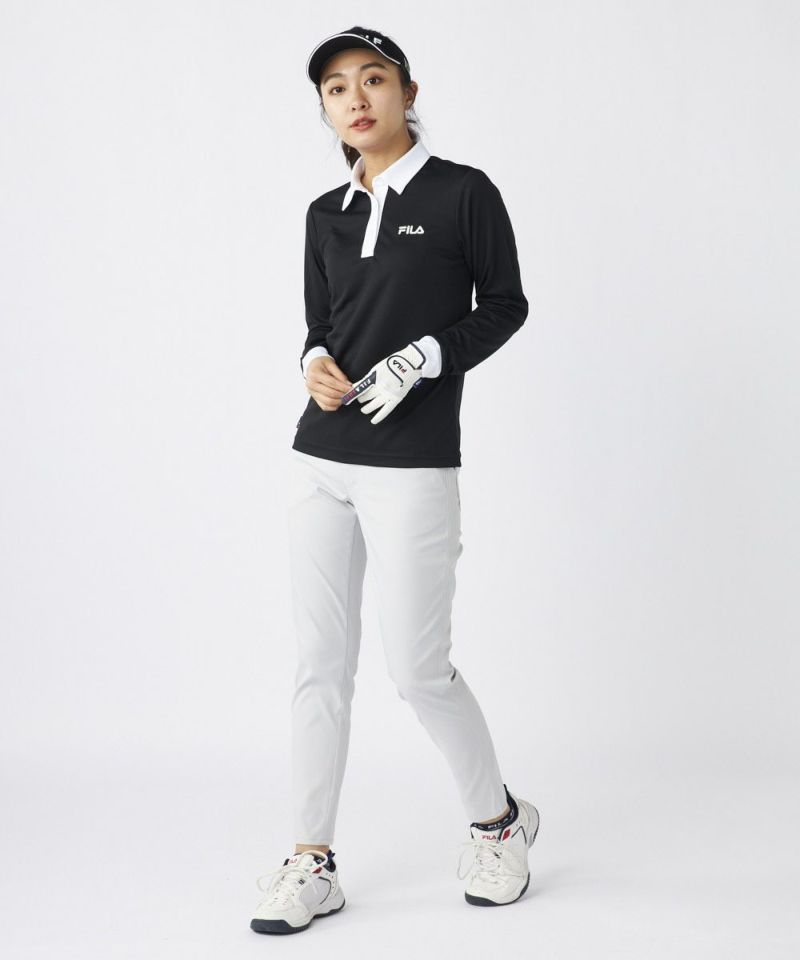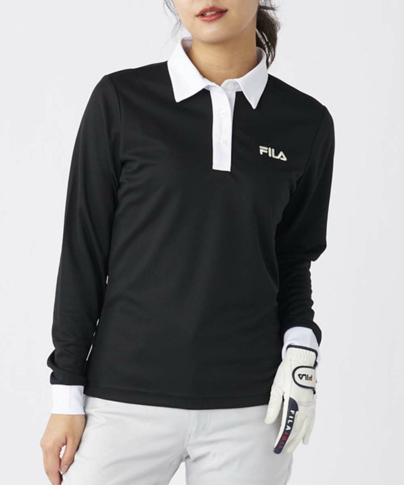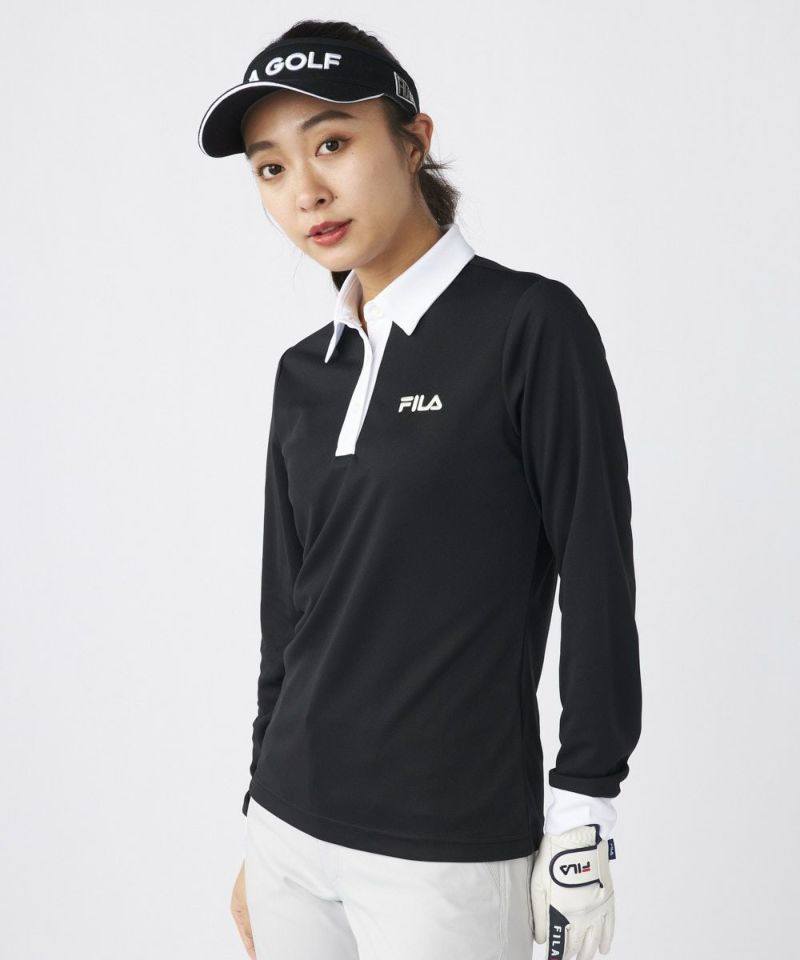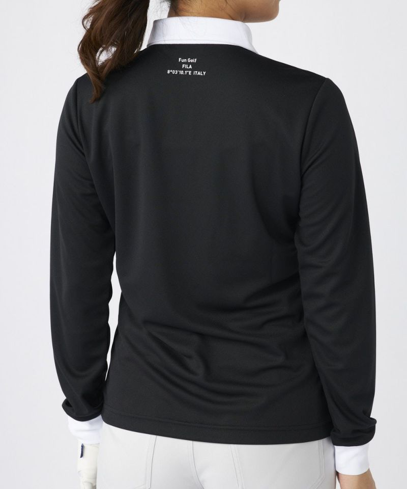 衿のバイカラーがかわいい長袖ポロシャツ。ベーシックなデザインなので、スカート、パンツ選ばずコーディネートを楽しめます。