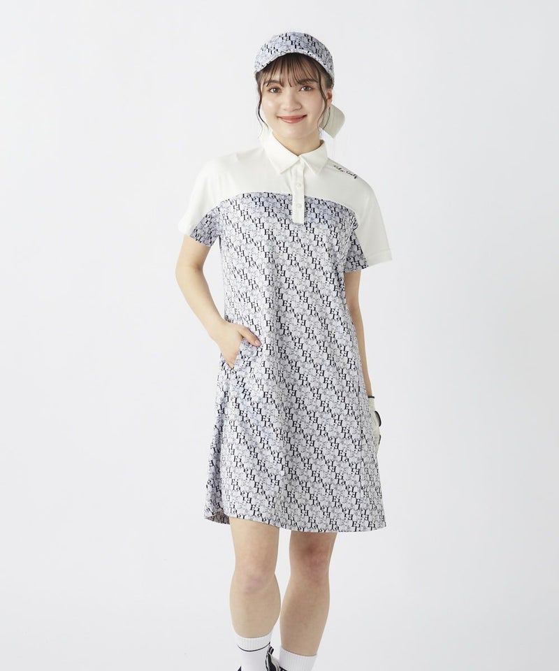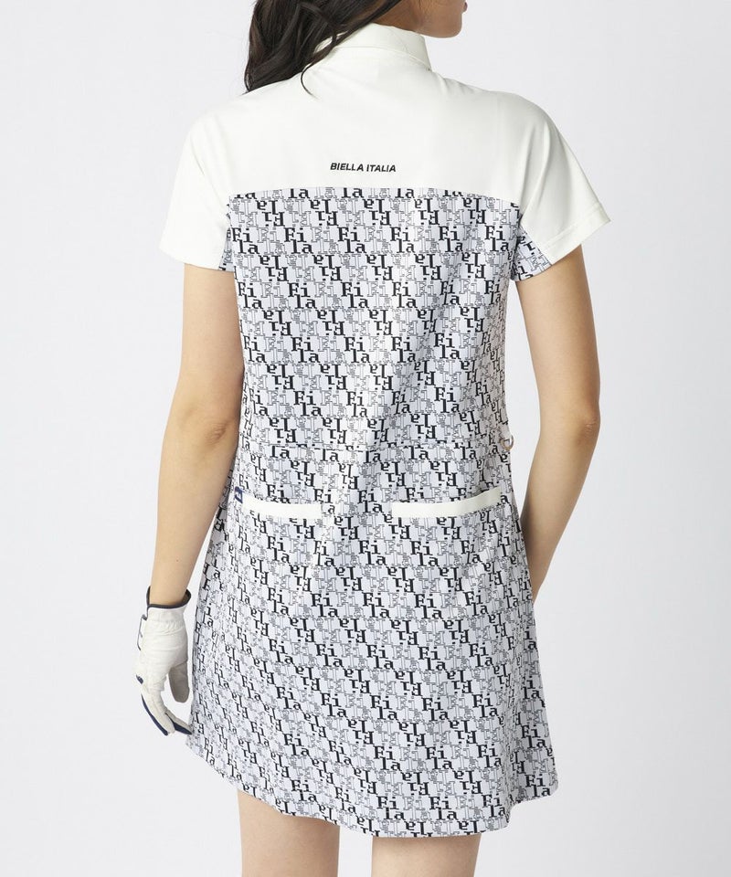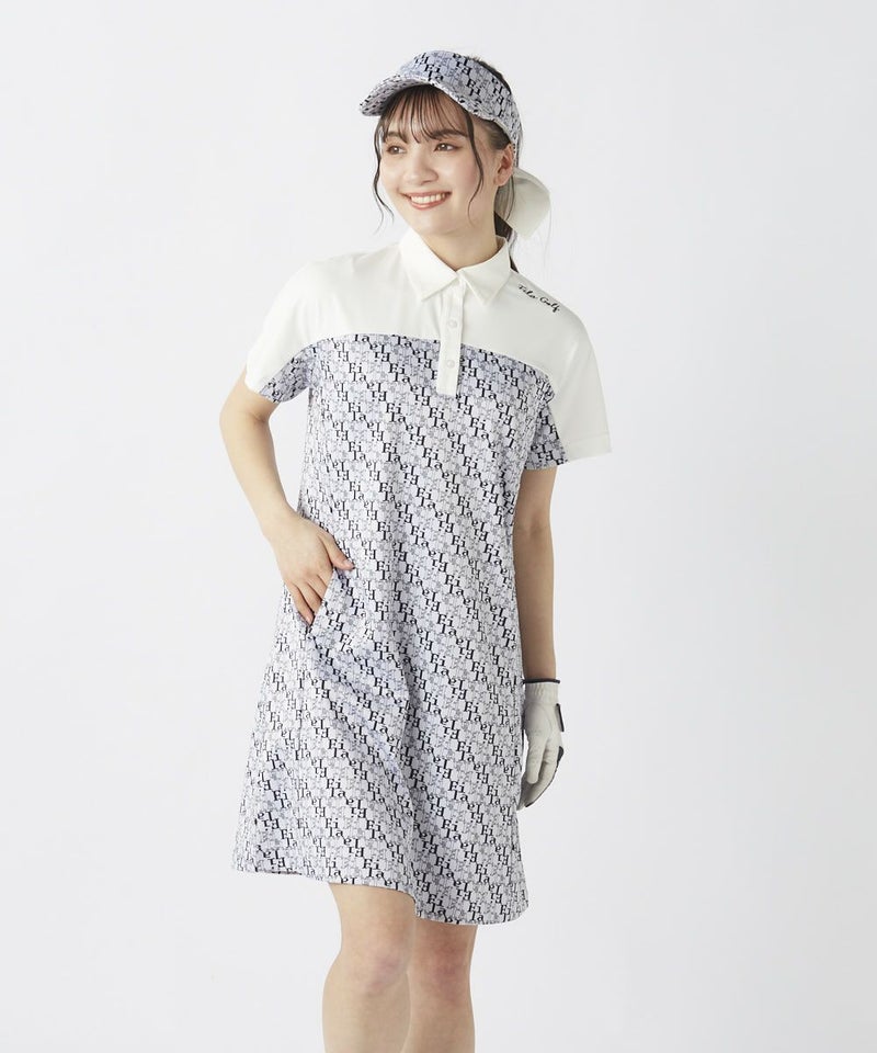 襟と袖部分はホワイトで切り替えられ、クラシックなポロシャツ風のディテールがゴルフシーンにぴったり!