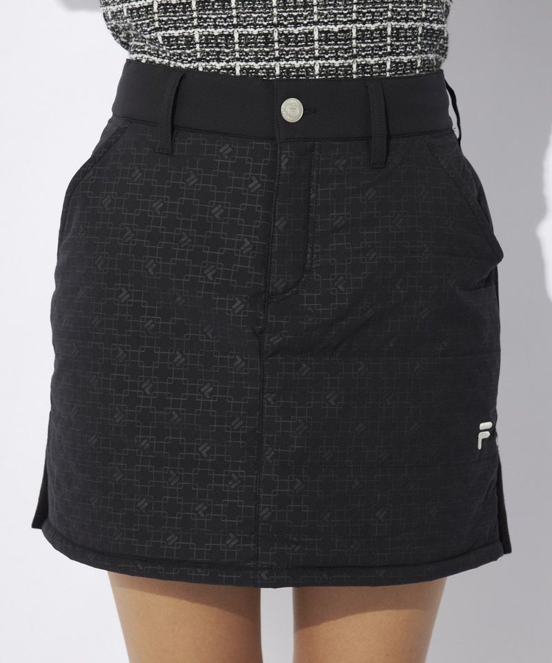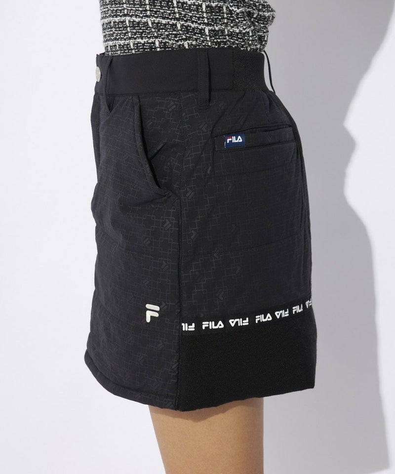 細かいロゴ柄に、ロゴテープでアクセントをつけた異素材ミックスの中綿スカート。