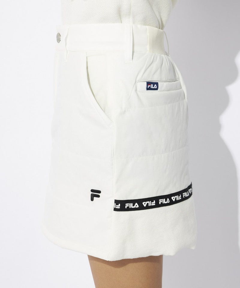 細かいロゴ柄に、ロゴテープでアクセントをつけた異素材ミックスの中綿スカート。