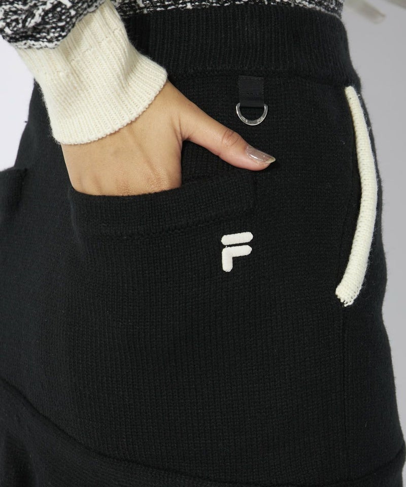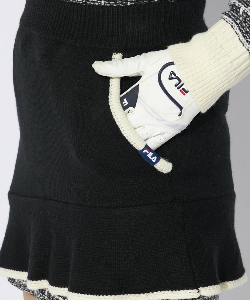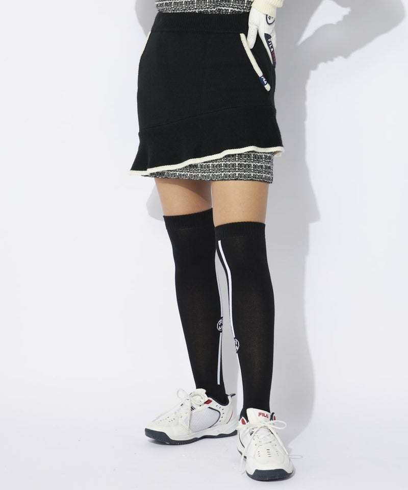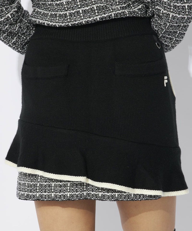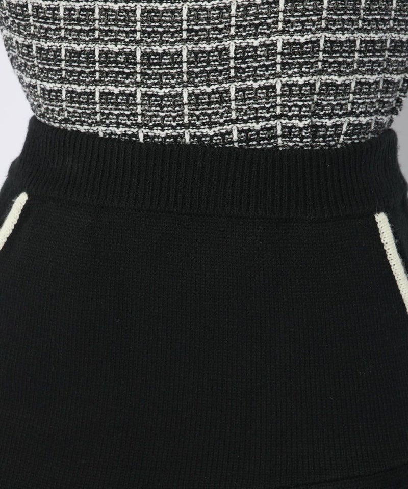 裾のツイードライクな編地がアクセントになった、ラッフル使いが大人かわいいニットスカート。同素材のセー ターとのセットアップコーデがおすすめです。