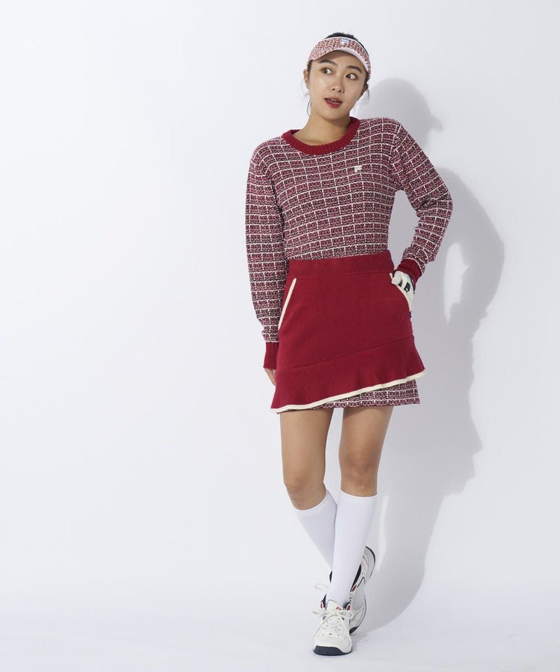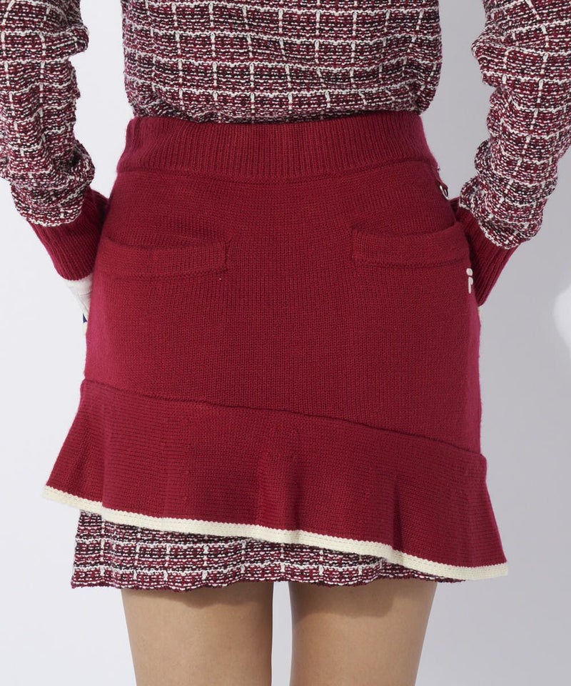 裾のツイードライクな編地がアクセントになった、ラッフル使いが大人かわいいニットスカート。同素材のセー ターとのセットアップコーデがおすすめです。
