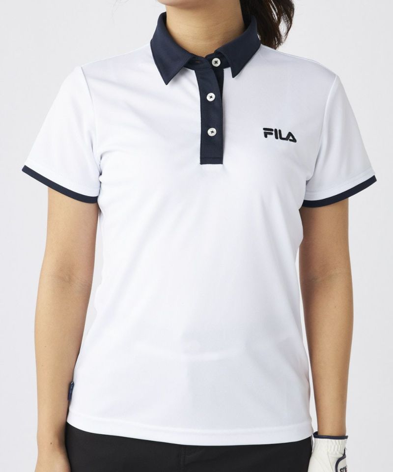 衿のバイカラーがかわいい半袖ポロシャツ。ベーシックなデザインなので、スカート、パンツ選ばずコーディネートを楽しめます。程よい丈感で、アウトでもインでもバランスよく着用いただけます。バックデザインにはフィラゴルフのキャッチコピー【Fun Golf】のテキストを小さく入れており、細部までこだわったオシャレなデザインです。