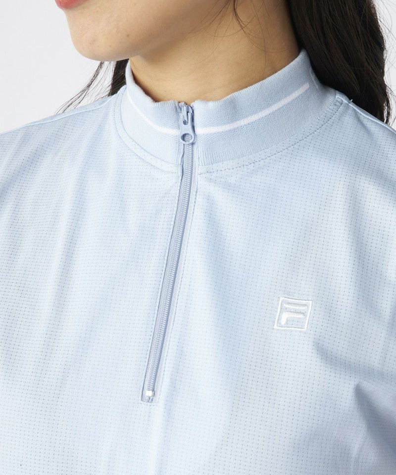 シンプルながらもスポーティな印象を与えるハーフジップ仕様で、襟元にはさりげないロゴがあしらわれています。