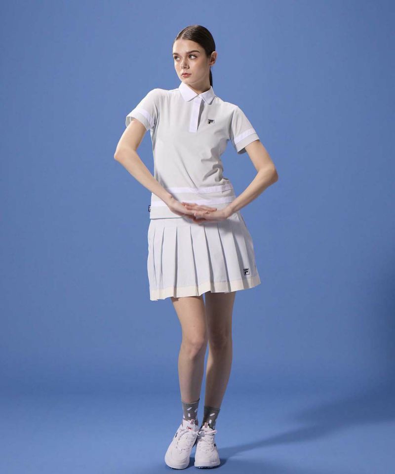 素材は 薄くてサラッとしたポリエステル素材で吸汗速乾、UVカットと高機能なエコ素材です。同シリーズのプリーツスカートとセットアップでの着用がおしゃれ!